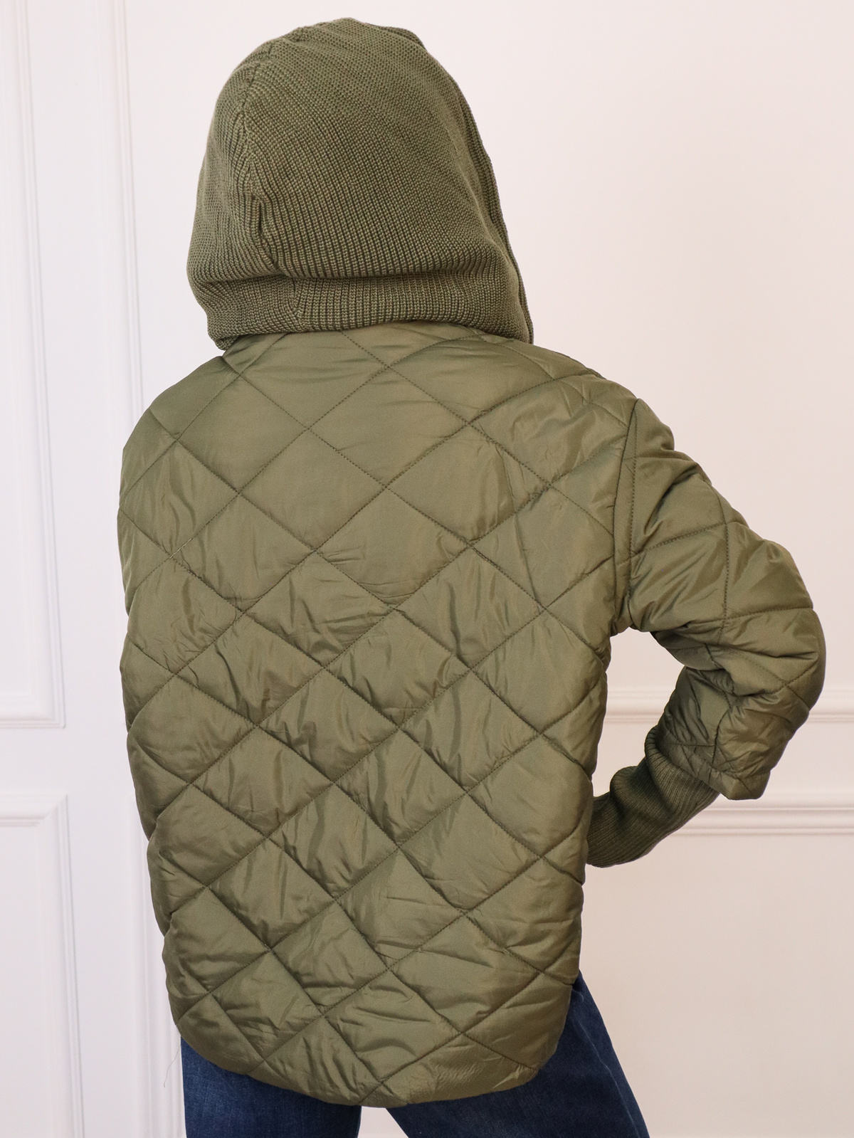 PIKOWANA KURTKA ZE SWETERKOWYM KAPTUREM I ŚCIĄGACZEM NA RĘKAWIE- ZIELONA