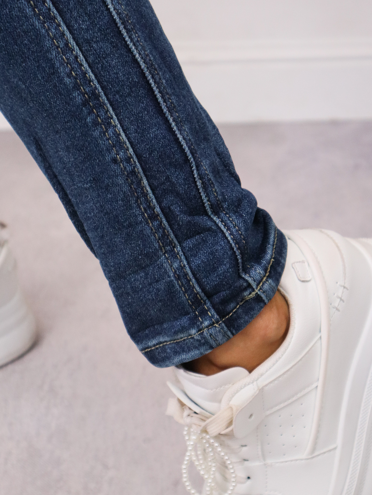 SPODNIE JEANSOWE Z PRZESZYCIAMI I WYSOKIM STANEM- GRANATOWE