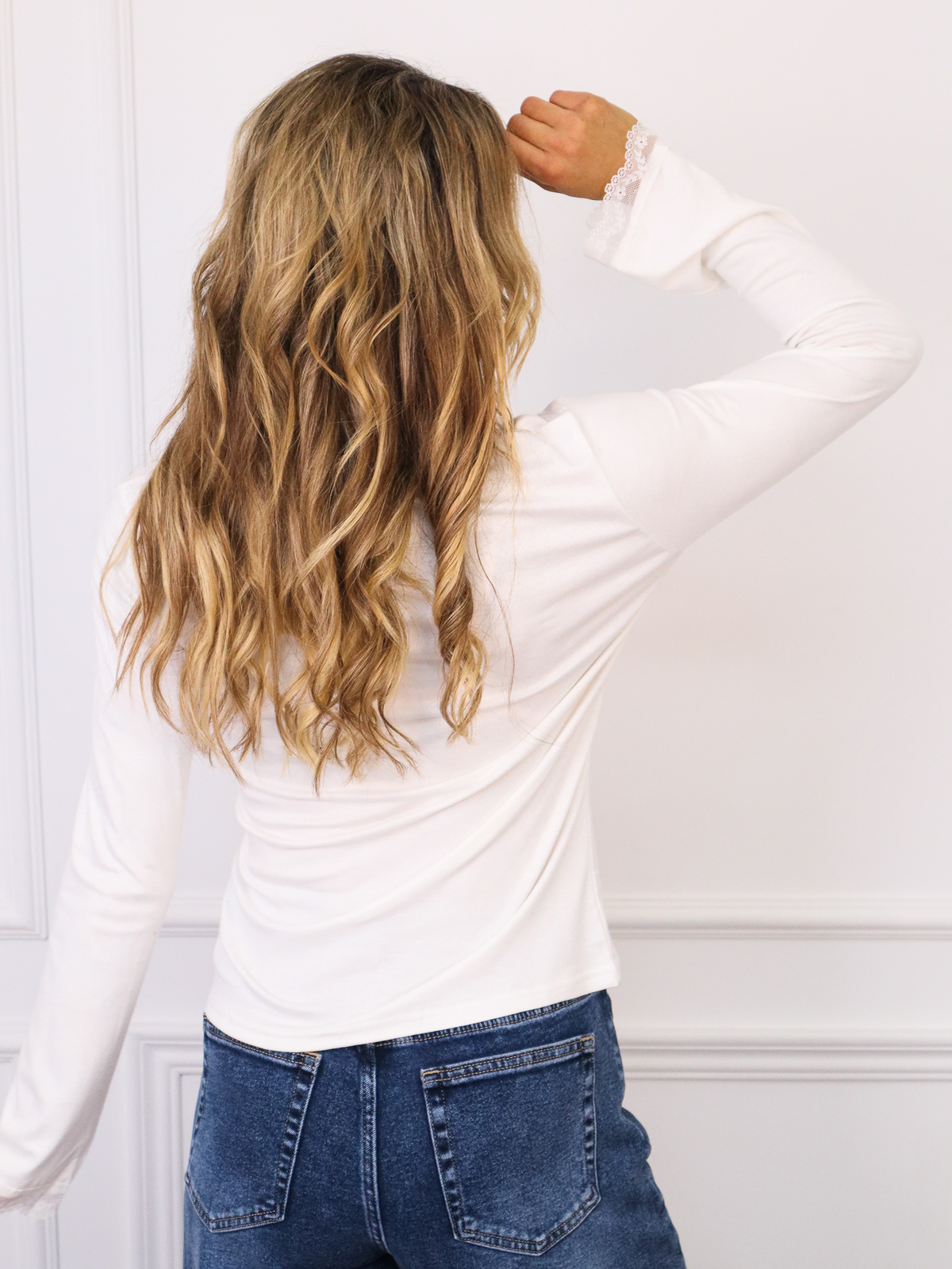 Bluzka o dopasowanym kroju wykonany z wiskozy. Okrągły dekolt oraz długie dopasowane rękawy. Brzegi dekoltu oraz rękawa wykończone koronką.
