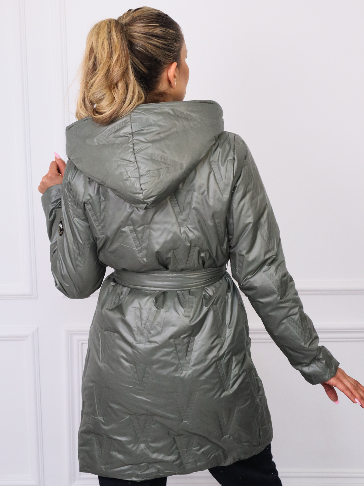 Stylowa i praktyczna kurtka o długości do połowy uda, z ociepleniem i delikatnym połyskiem. Model z wiązaniem w talii podkreślającym sylwetkę, zapinany na napy i suwak. Wyposażona w kaptur i kieszenie boczne. Idealna na chłodniejsze dni. Wzór w literę „V”