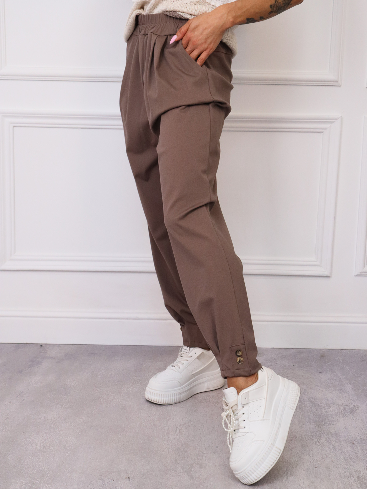SPODNIE MATERIAŁOWE Z OZDOBNYMI GUZIKAMI NA DOLE NOGAWEK- FANGO