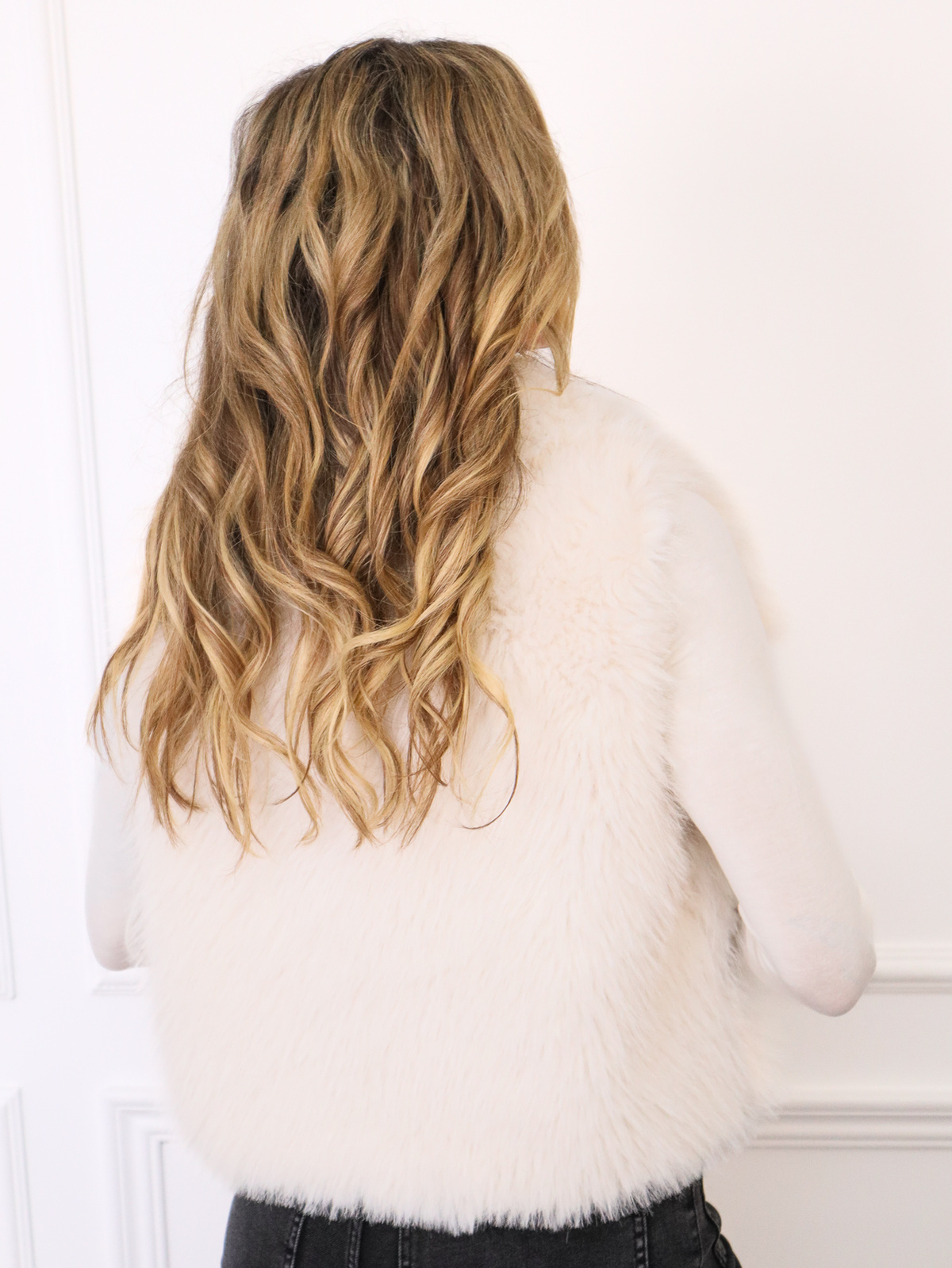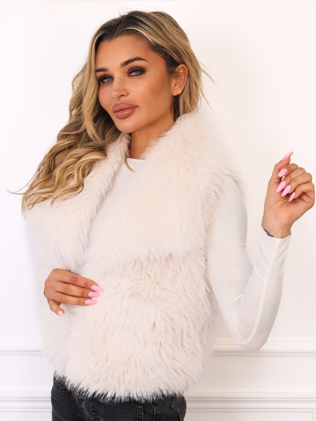 Kamizelka z kołnierzykiem, wykonana z przyjemnego w dotyku futerka. To propozycja o krótszym fasonie, zapinana na haftki. Z przodu znajdują się funkcjonalne kieszenie, a pod spodem podszewka.