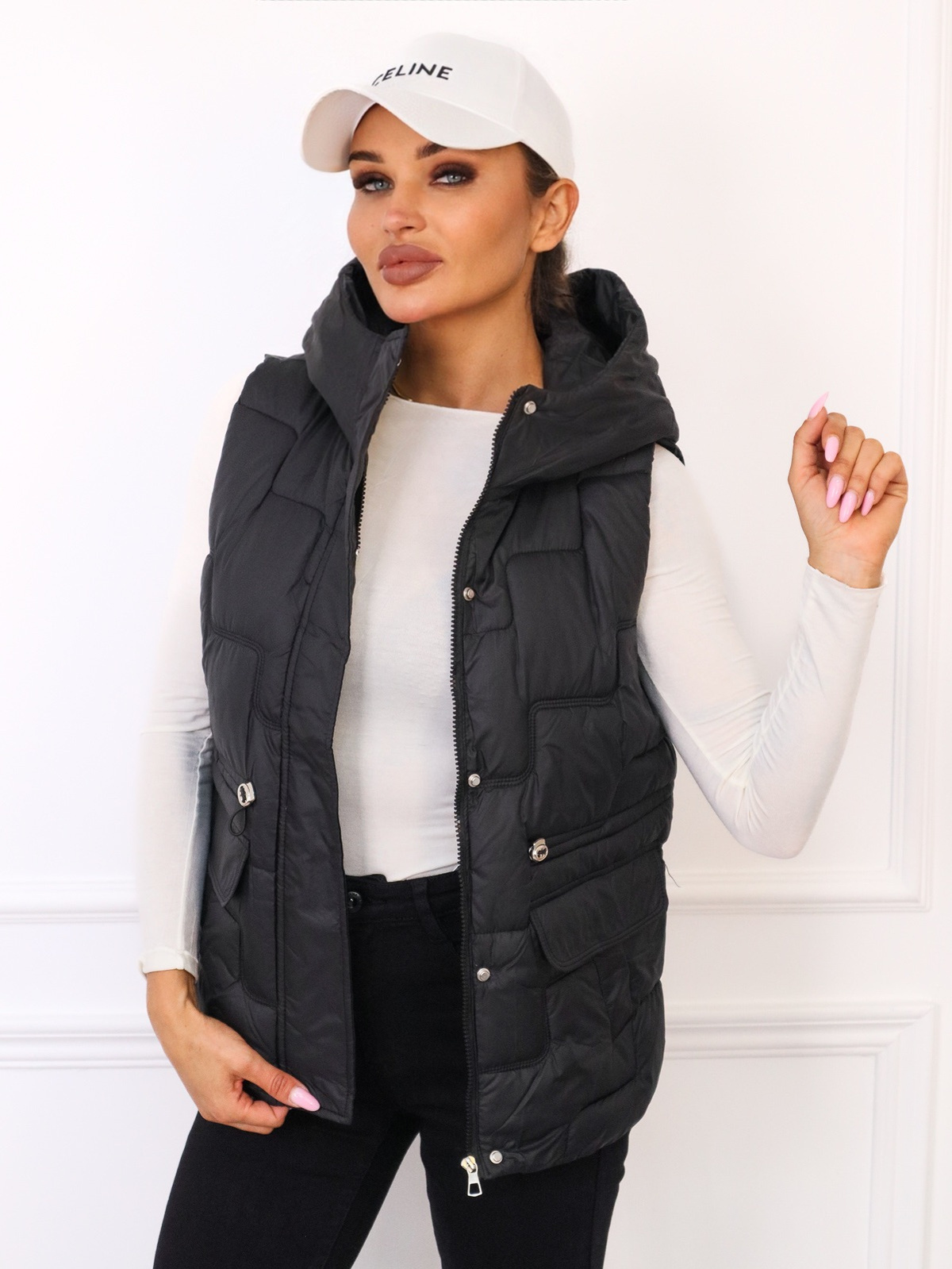 KAMIZELKA PIKOWANA ZE ŚCIĄGACZEM W PASIE- CZARNA