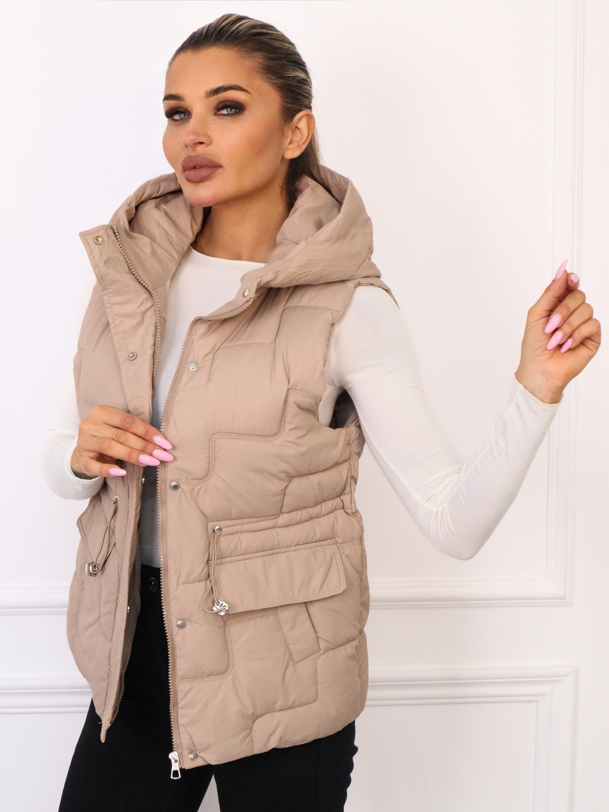 Kamizelka pikowana ze ściągaczem w pasie. Zapinana na zamek i napy. Kaptur w tym modelu NIE jest odpinany.