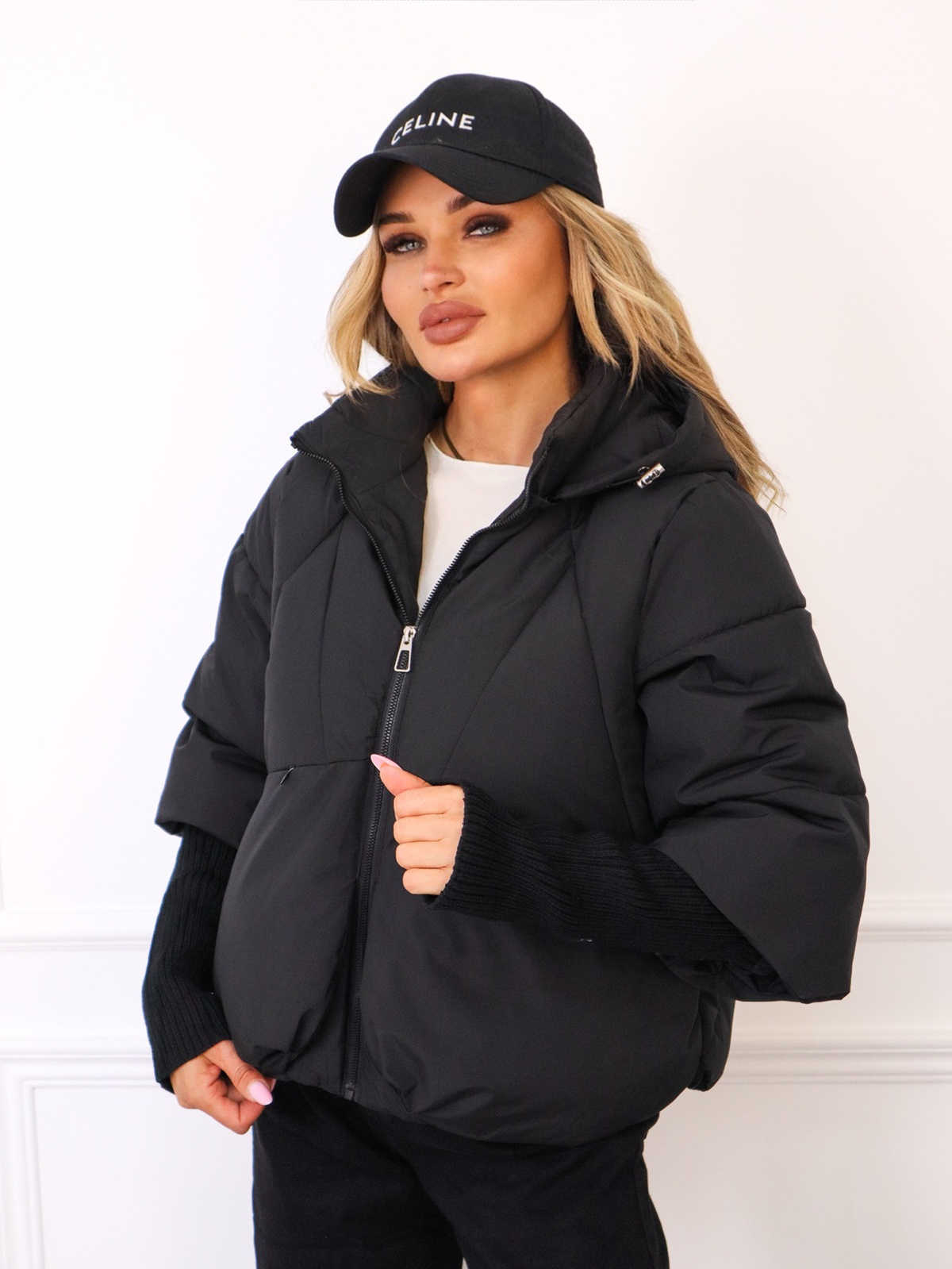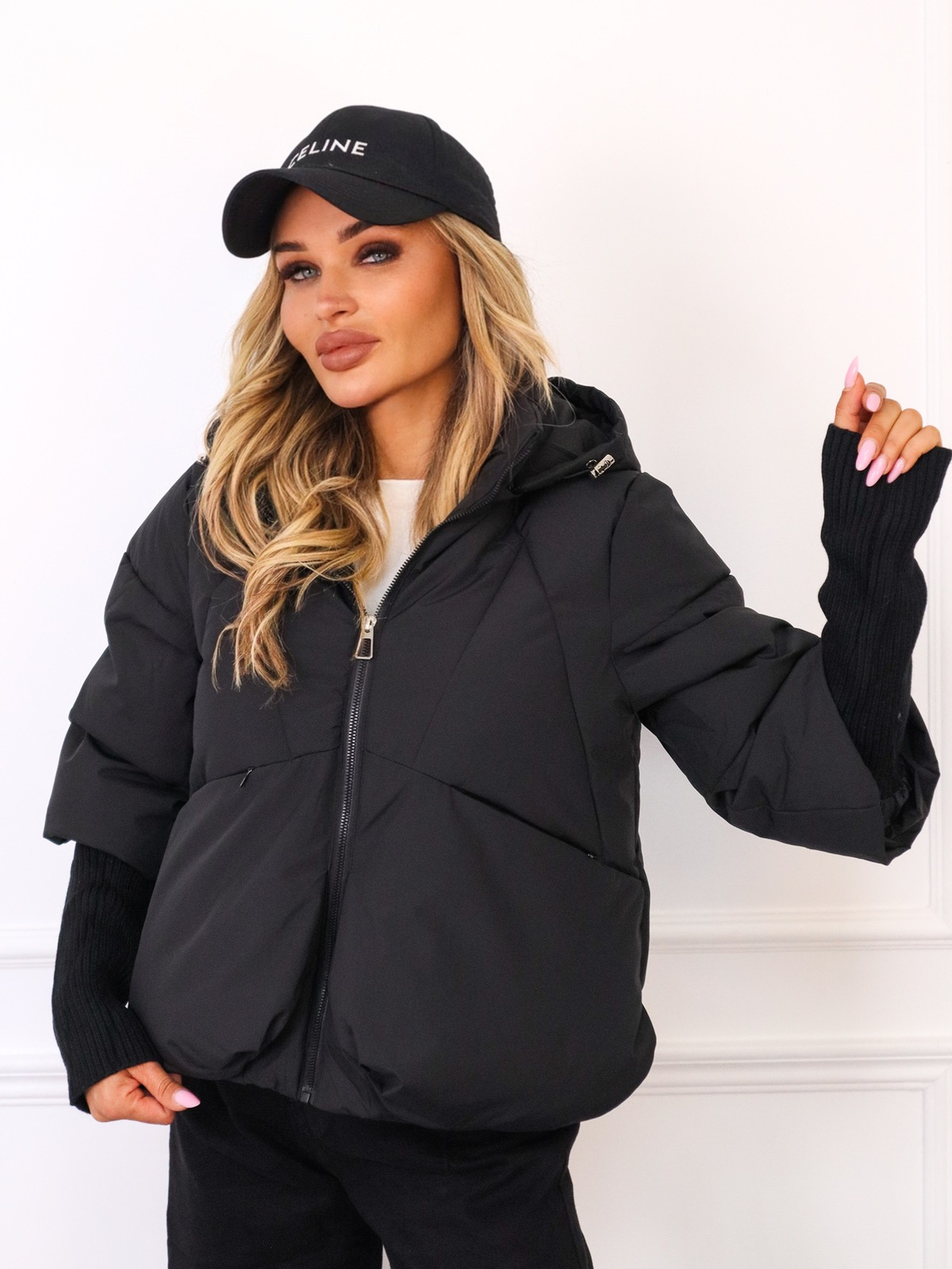 KURTKA PUCHOWA Z DZIANINOWYMI WSTAWKAMI PRZY RĘKAWACH- CZARNA