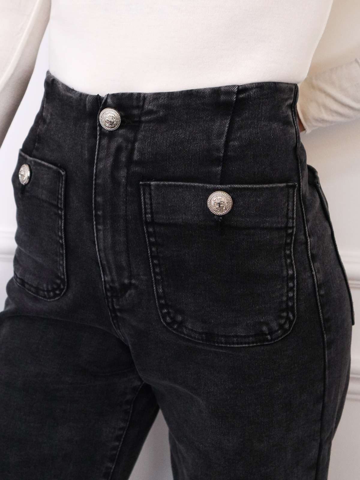 SPODNIE JEANSOWE Z OZDOBNYMI GUZIKAMI I KIESZENIAMI Z PRZODU- CZARNE