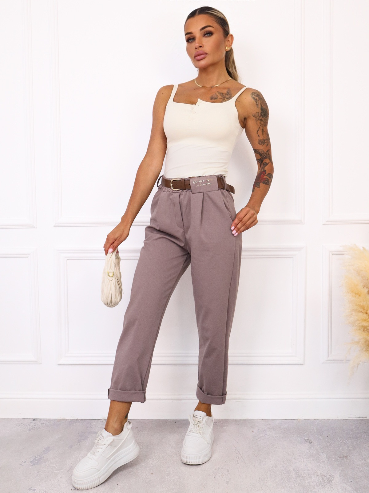 SPODNIE MATERIAŁOWE Z NASZYWKĄ+ PASEK- CAPPUCCINO