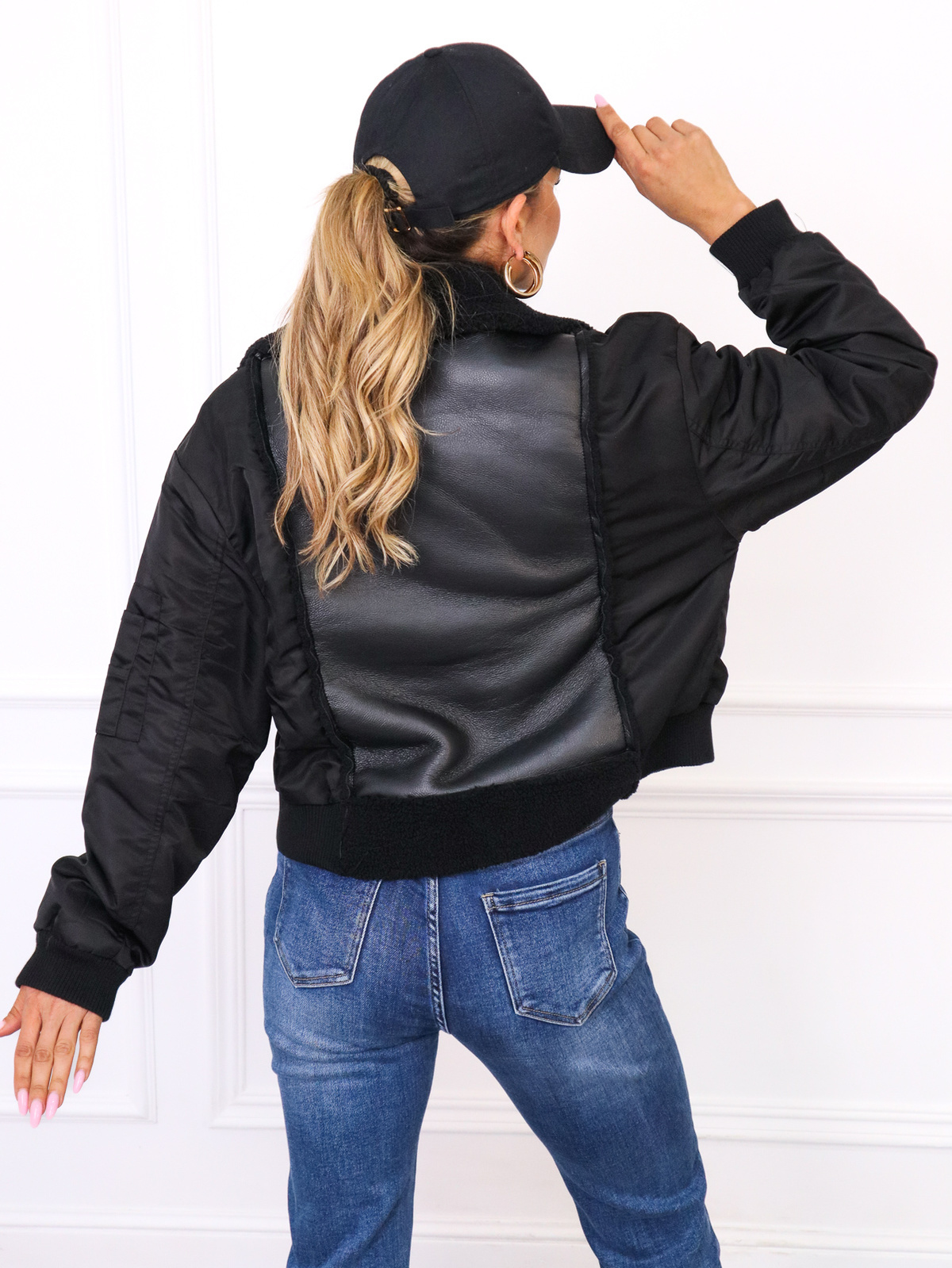 KURTKA BOMBERKA ZE WSTAWKAMI Z IMITACJI SKÓRY- CZARNA