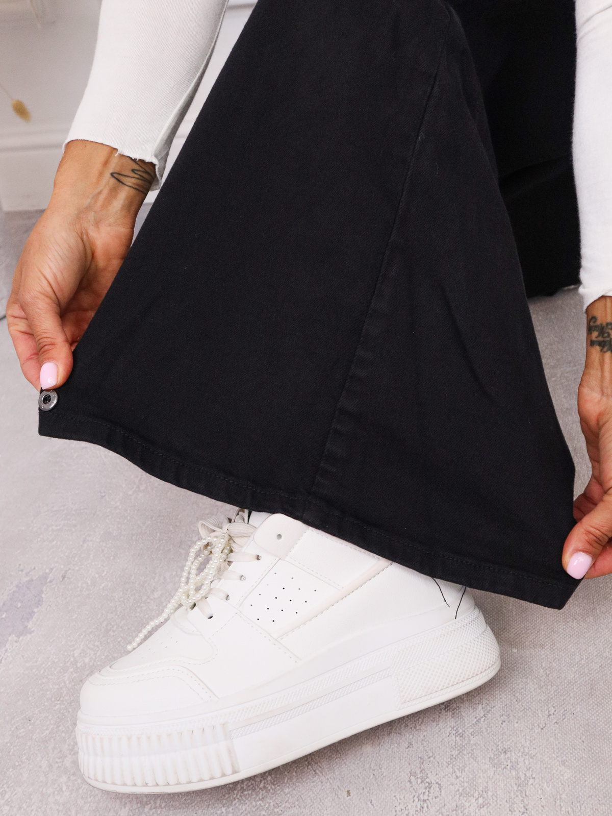 Spodnie jeansowe o luźnym fasonie oraz szerokimi nogawkami zapinanymi na dole za zatrzask. Posiadają obniżony krok oraz luźna przestrzeń w biodrach. Na przodzie znajduje się ozdobne przeszycie.
