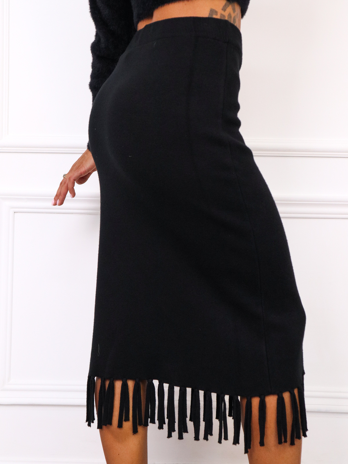 DZIANINOWA SPÓDNICA MIDI ZAKOŃCZONA FRĘDZLAMI-CZARNA