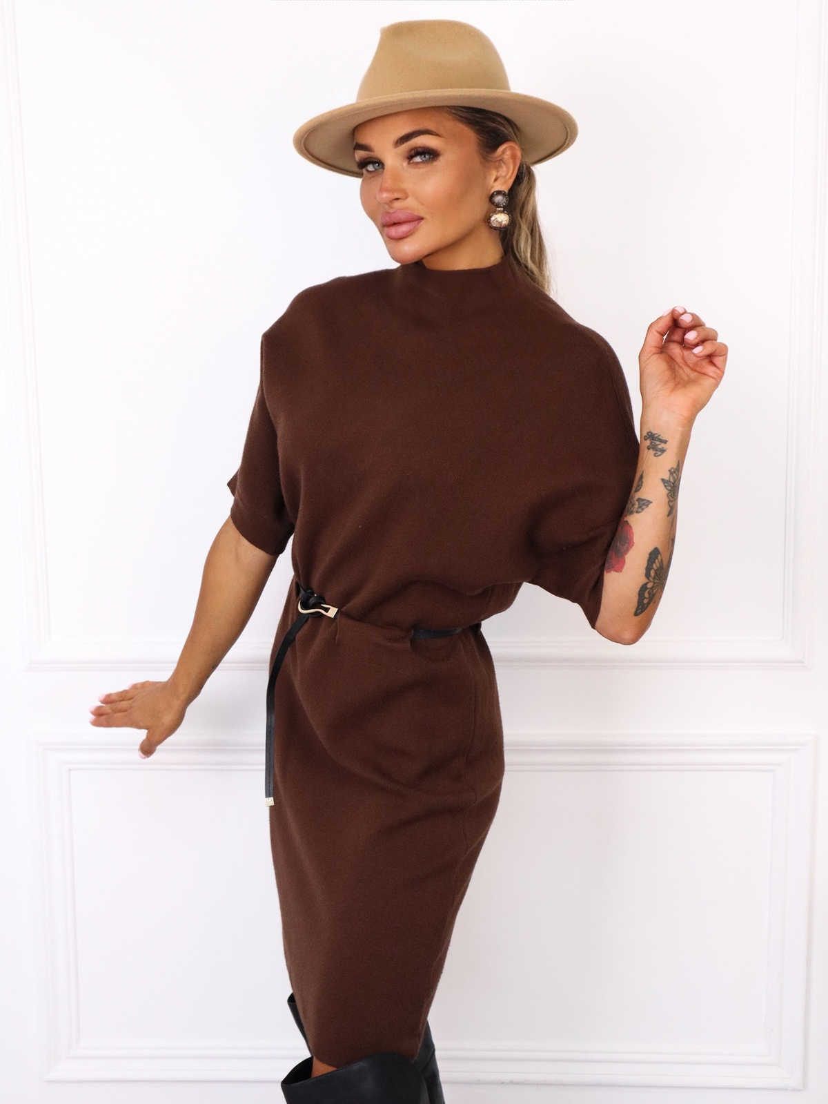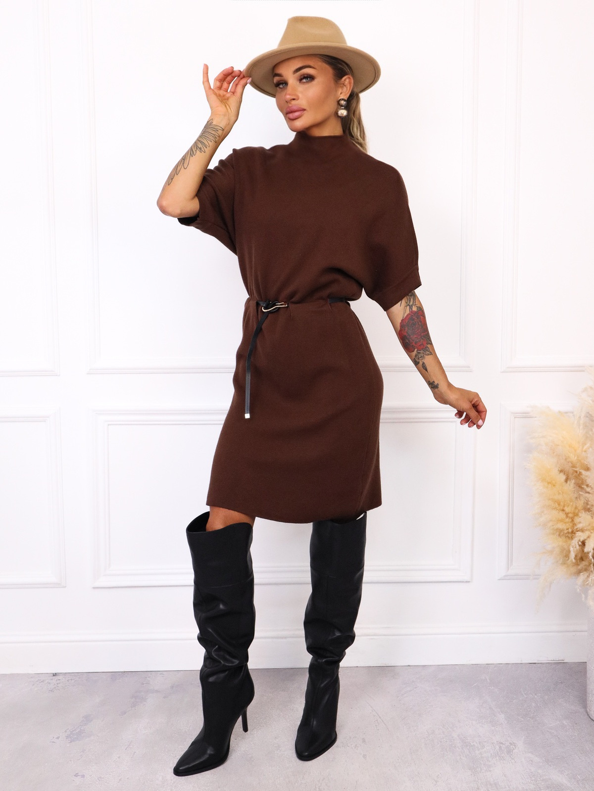 SUKIENKA SWETERKOWA Z PÓŁGOLFEM I PASKIEM- CIEMNY BRĄZ