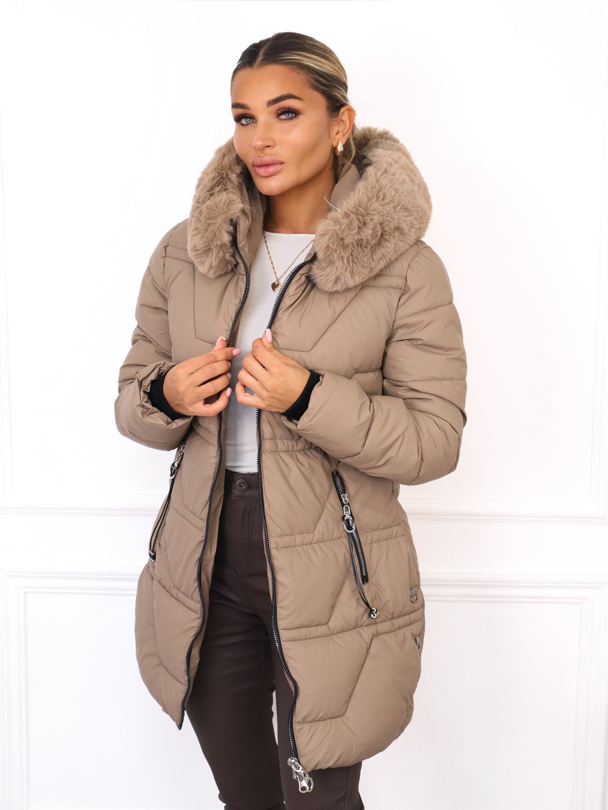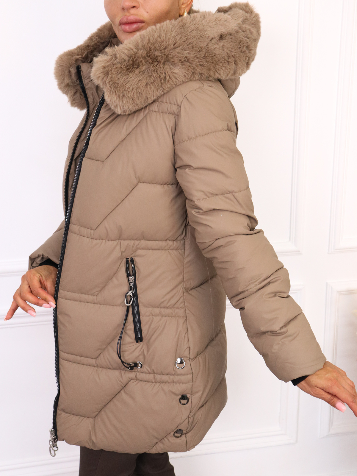 Długa pikowana kurtka, kieszenie zapinane na zamek, po bokach ozdobne elementy. Odpinane futerko przy kapturze.