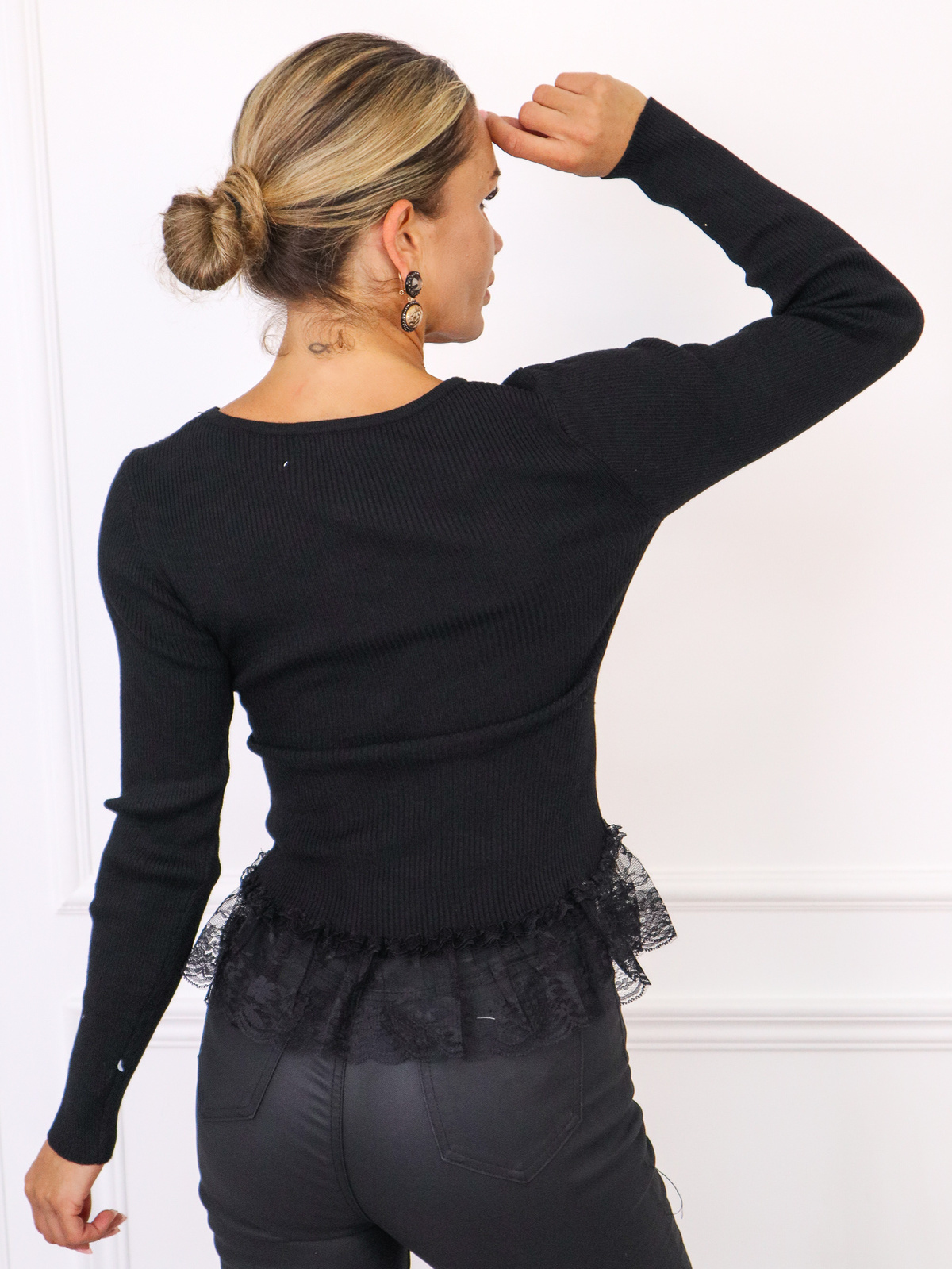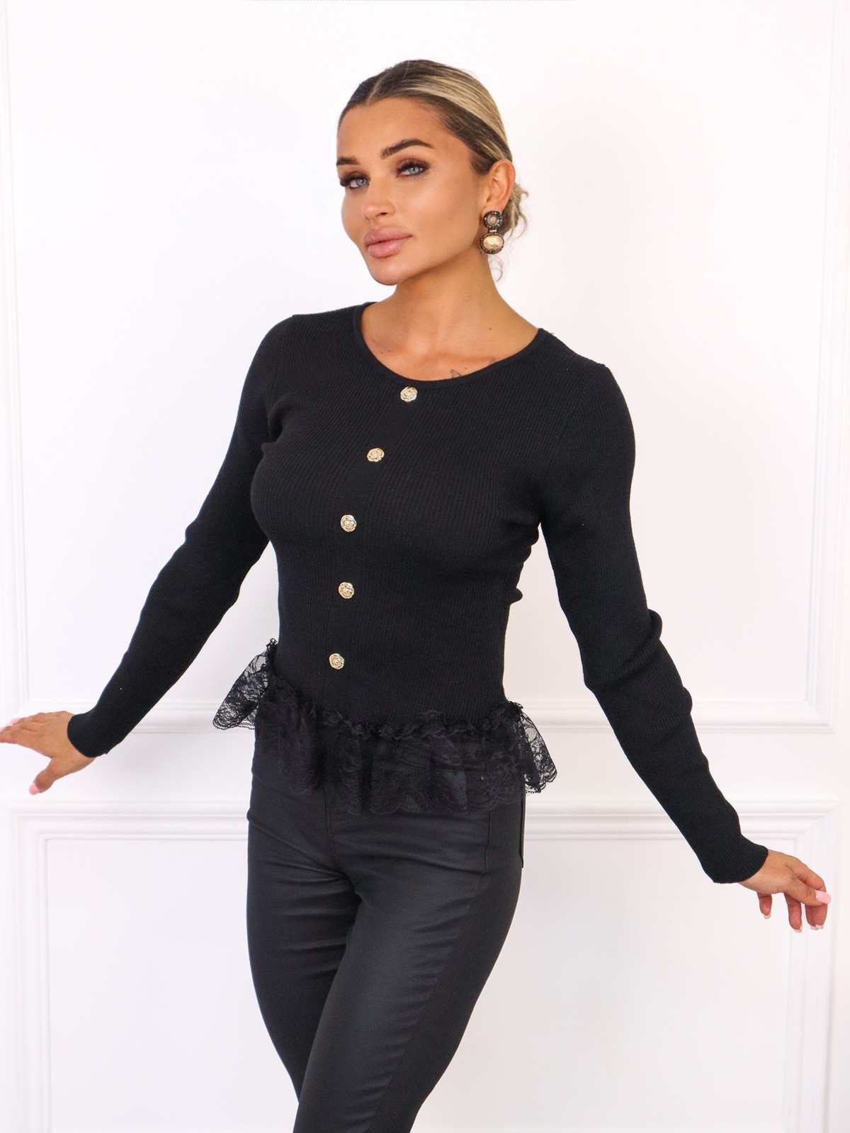 SWETER Z OZDOBNYMI GUZIKAMI ZAKOŃCZONY KORONKĄ- CZARNY