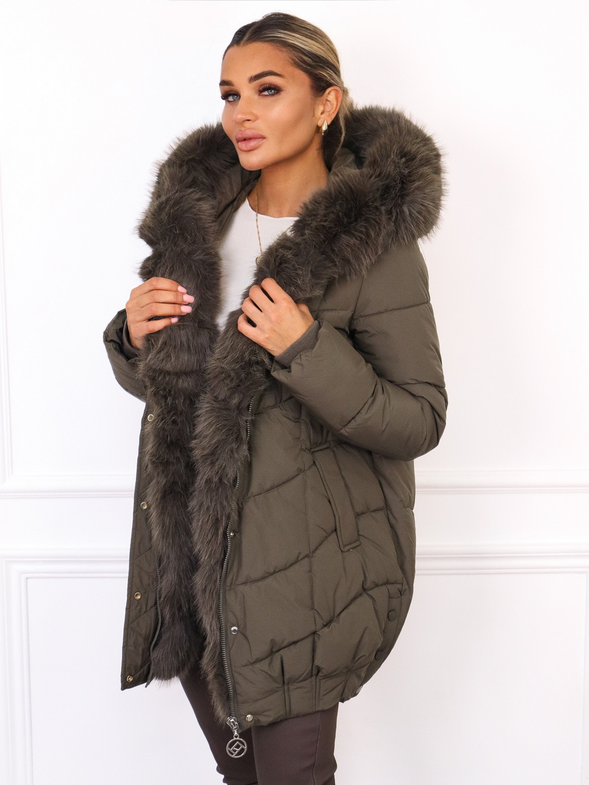 Kurtka pikowana zwężana na dole. Zapinana na zamek i zatrzaski. Odpinane futerko przy kapturze.