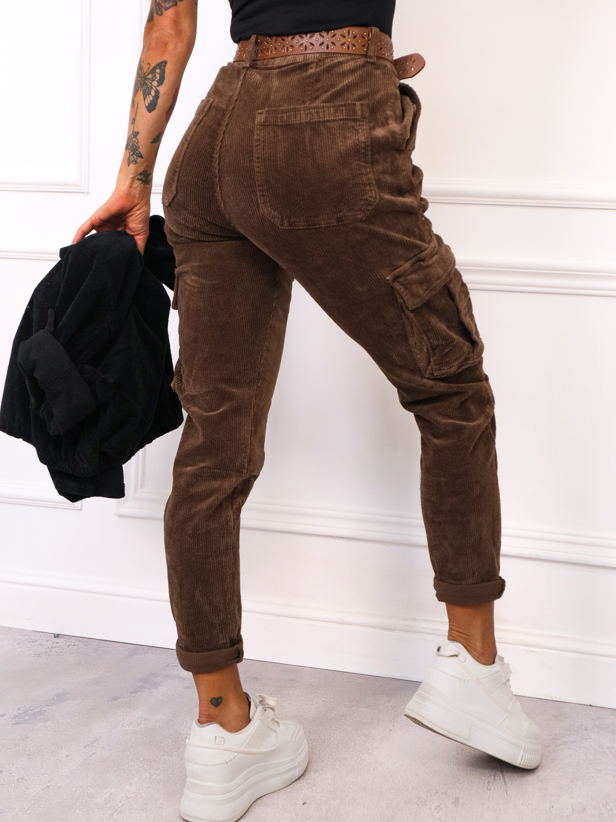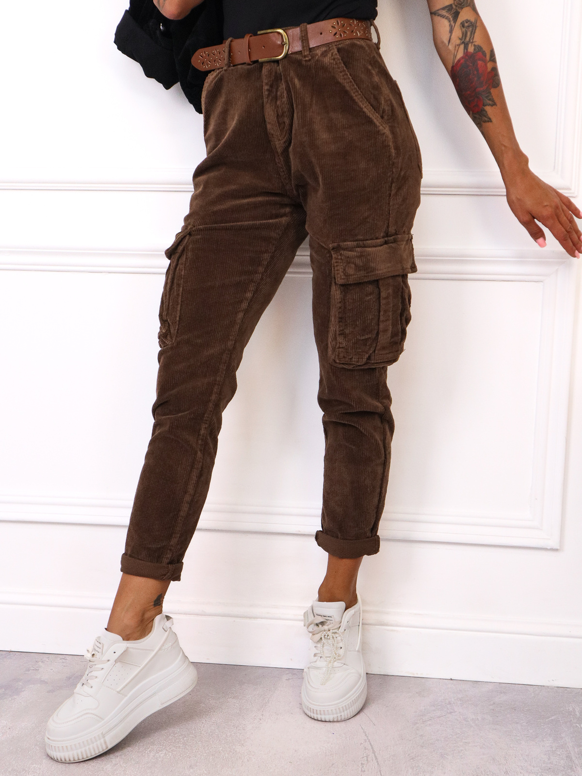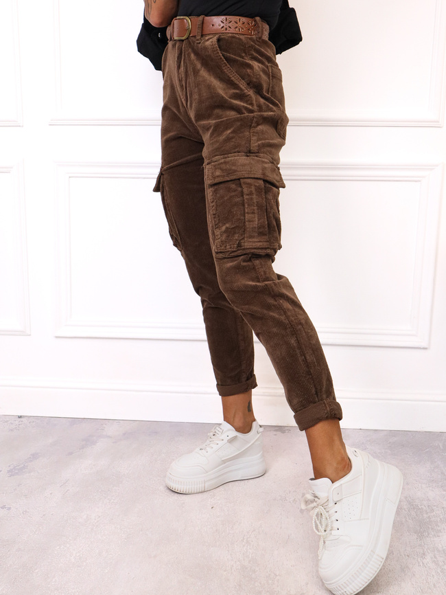 SPODNIE SZTRUKSOWE BOJÓWKI Z PASKIEM- BRĄZOWE