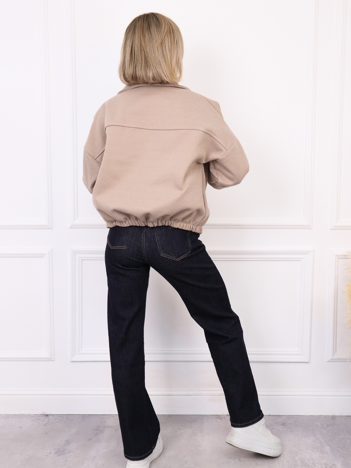 KURTKA OVERSIZE BEŻOWA W JASNE PASKI ZE ŚCIĄGACZEM NA DOLE