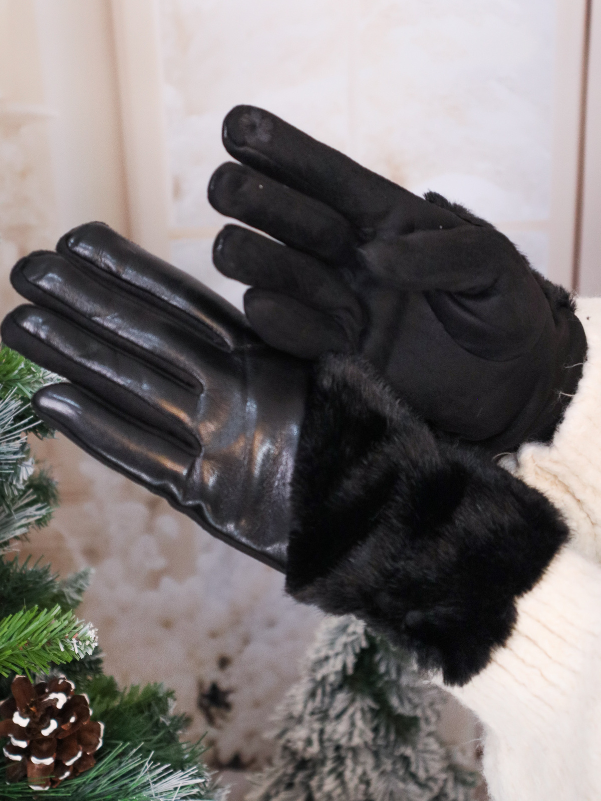 RĘKAWICZKI OCIEPLANE Z EKOSKÓRY I ZAMSZU Z FUTERKIEM- CZARNE