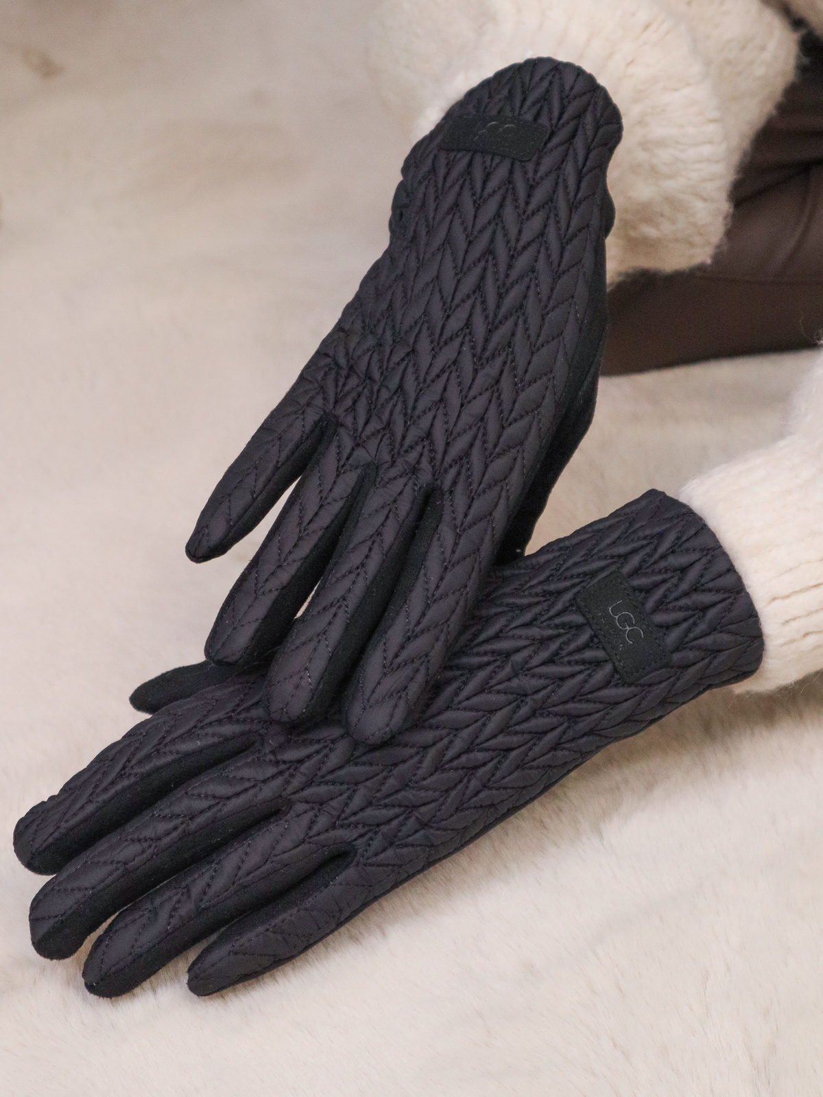 Rękawiczki wykonanae z zamszu połączonego z materiałem pikowanym oraz subtelnym logo, doskonałe na chłodniejsze dni. Końcówka palca wskazującego umożliwiającym obsługę ekranów dotykowych