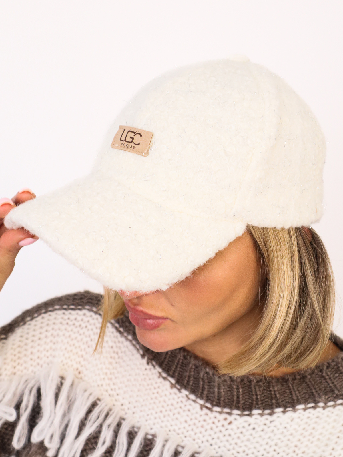 CZAPKA Z IMITACJI BARANKA Z DASZKIEM I LOGO-BIAŁA