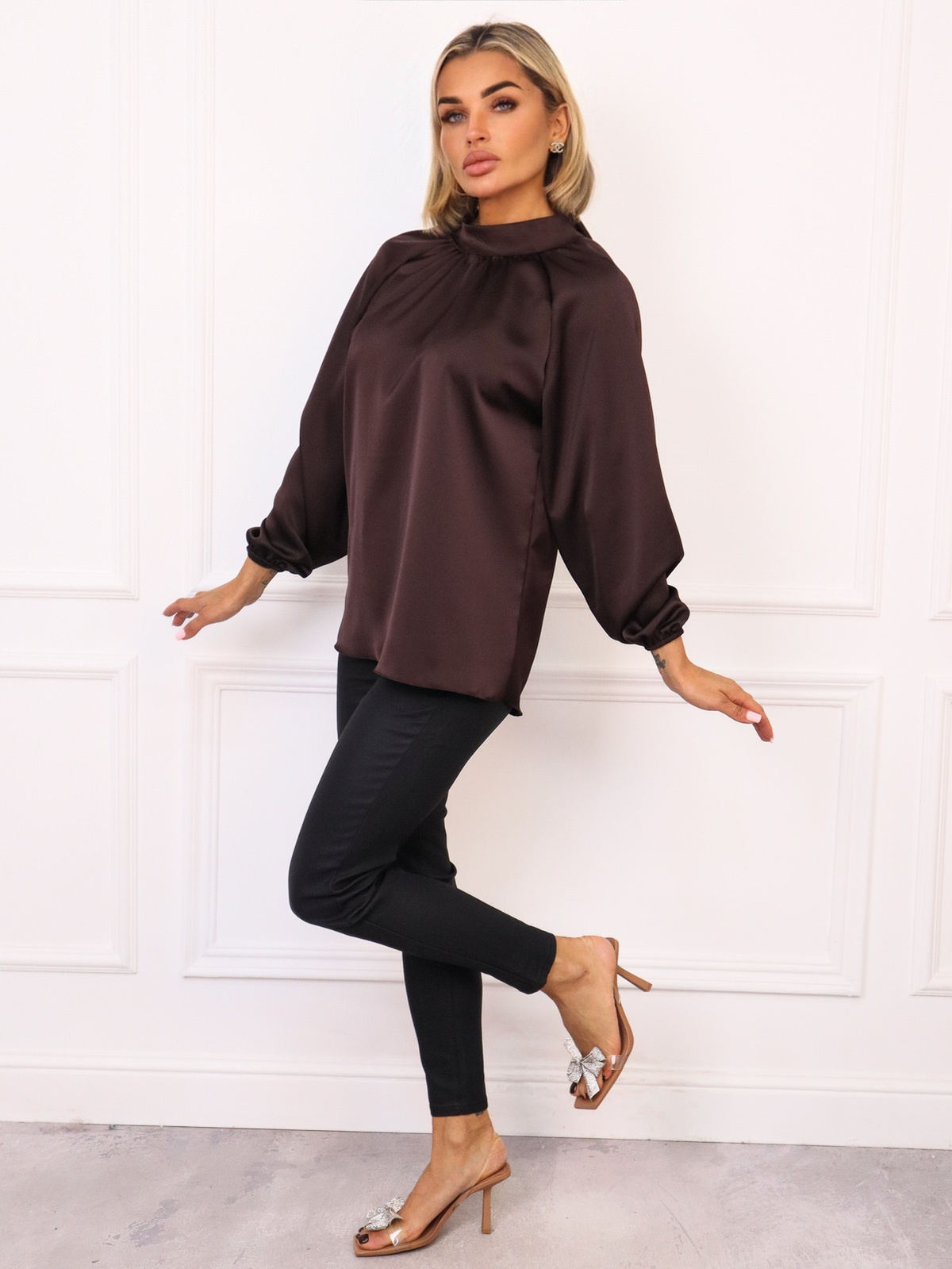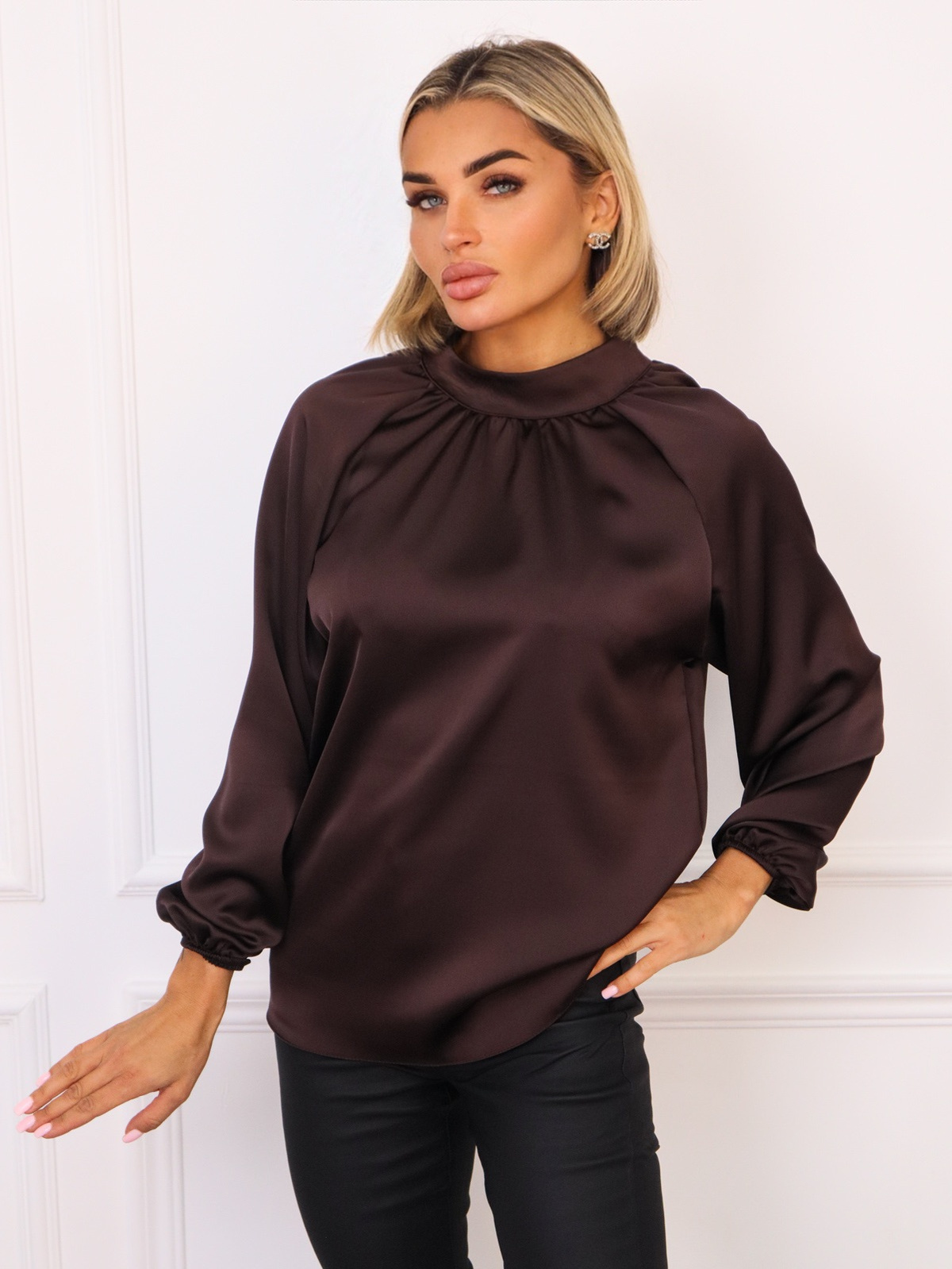 SATYNOWA BLUZKA ZE STÓJKĄ I RĘKAWAMI Z GUMKĄ- CZEKOLADOWA