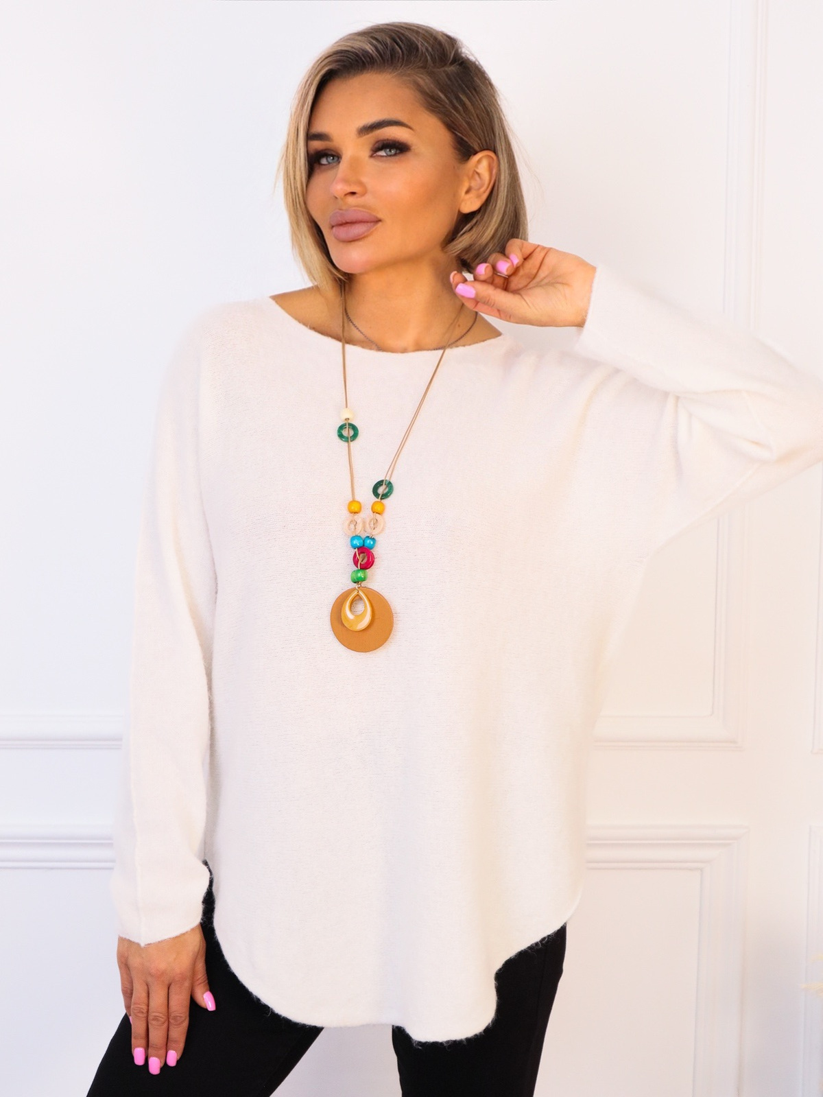Sweter dzianinowy jednolity z ozdobnym naszyjnikiem.