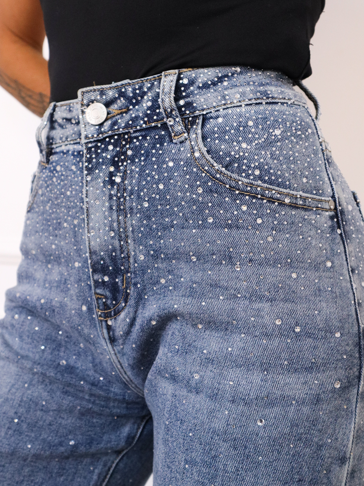 SPODNIE JEANSOWE MOM FIT ZDOBIONE CYRKONIAMI- NIEBIESKIE