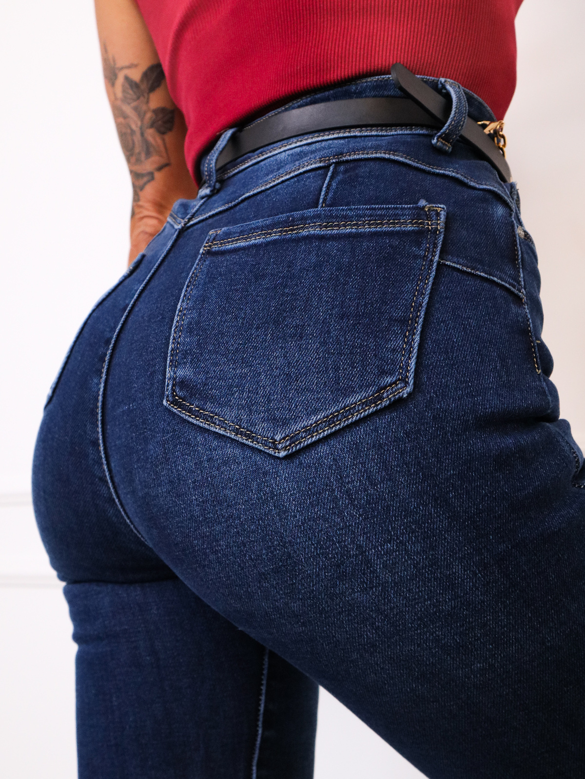 SPODNIE JEANSOWE SKINNY Z PRZESZYCIAMI PRZY KIESZENI + PASEK - GRANATOWE