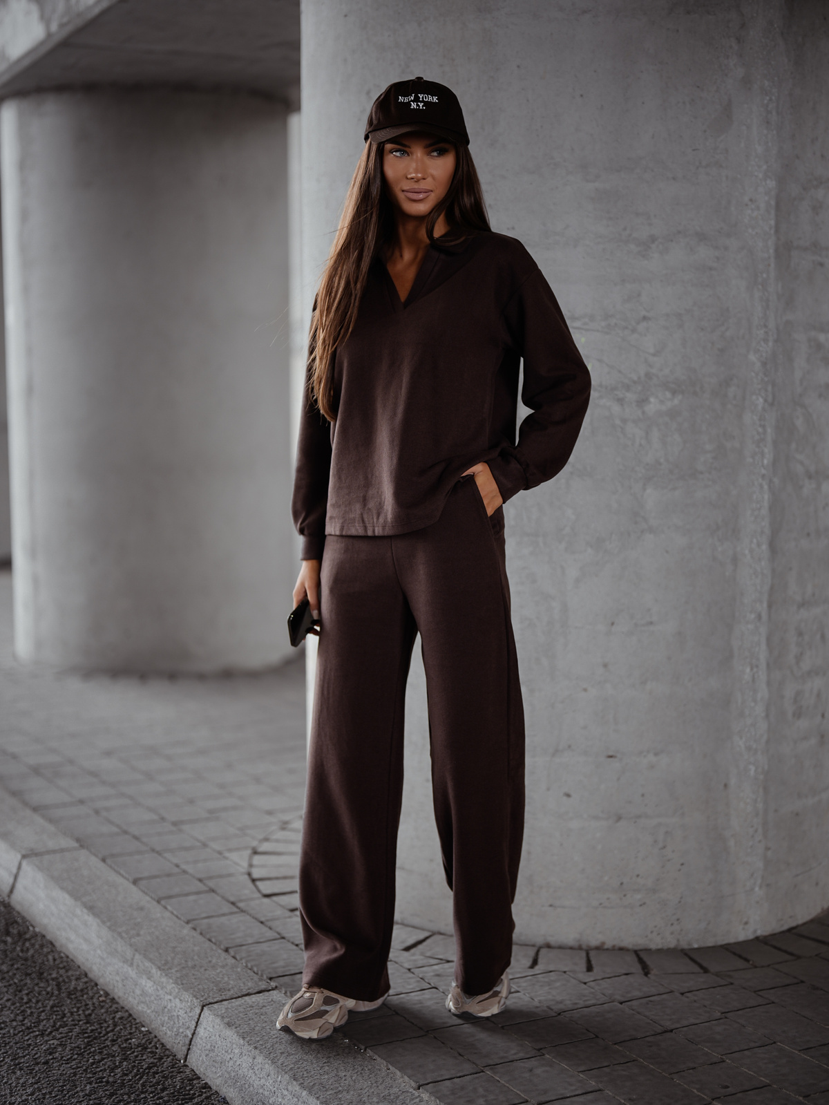 KOMPLET DZIANINOWY SWETERKOWA BLUZA+ SPODNIE- CZEKOLADOWY
