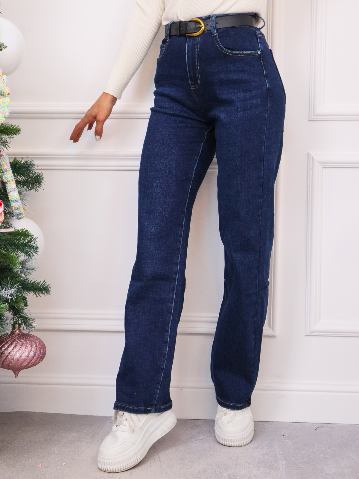 Dżinsy z 5 kieszeniami z bawełnianego denimu. Wysoki stan, rozporek na suwak i guzik. Proste szerokie nogawki.. Pasek gratis.