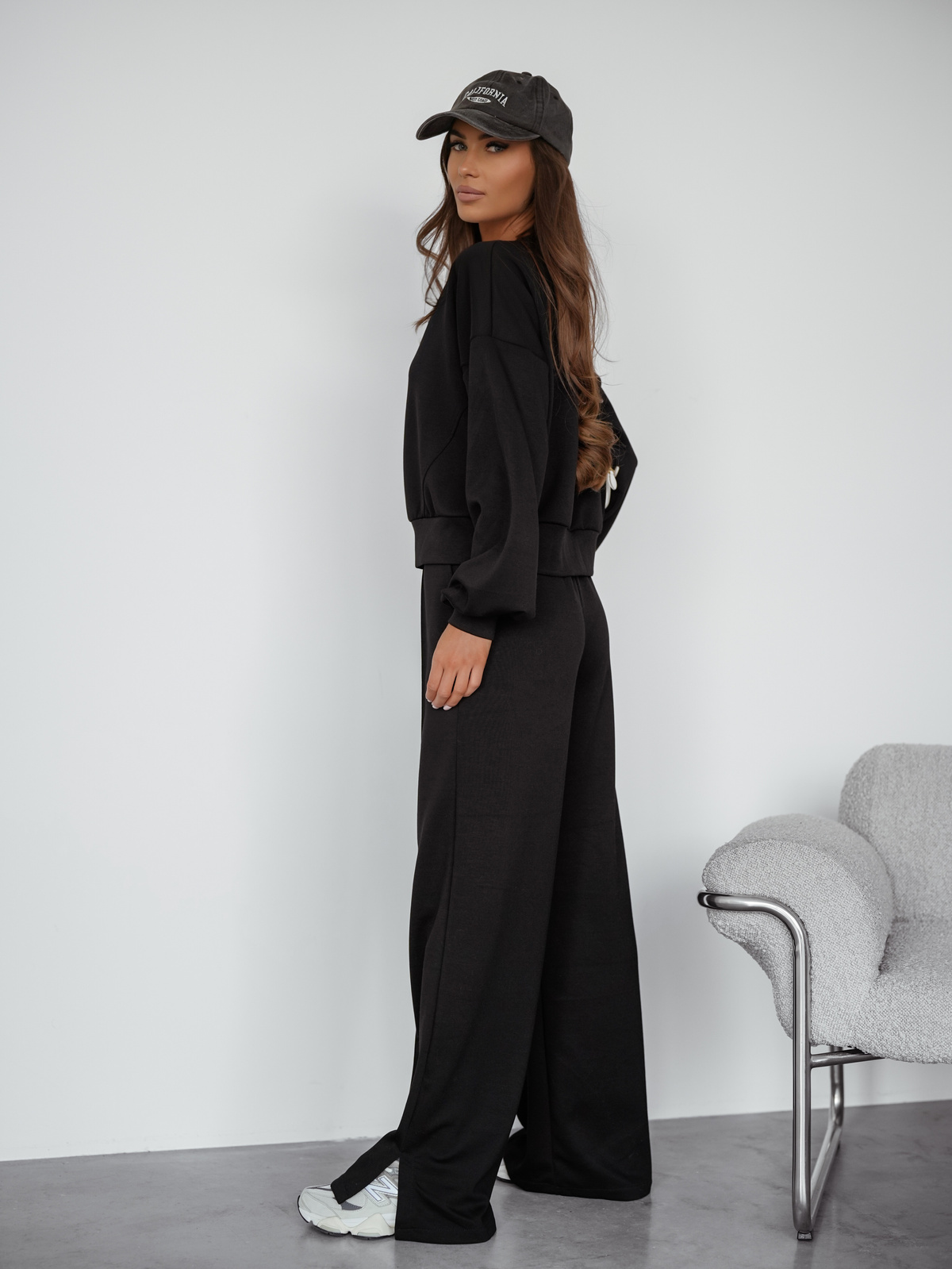 Komplet dresowy wykonany z materiału masełko, lekki i przyjemny w dotyku. Bluza klasyczna z okrągłym dekoltem. Spodnie w pasie z szeroką gumą i kieszeniach po bokach. oraz szerokie nogawki z przeszyciem z przodu i rozcięciem na nogawce.