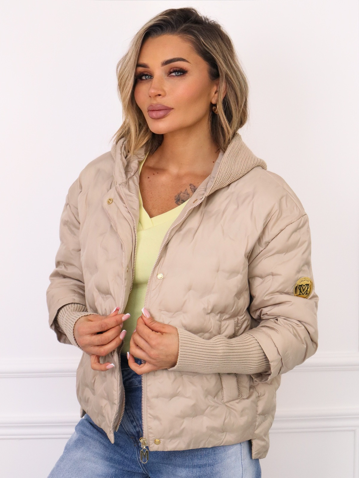 Kurtka przejściowa asymetryczna z dzianinowym kapturem i ściągaczami.