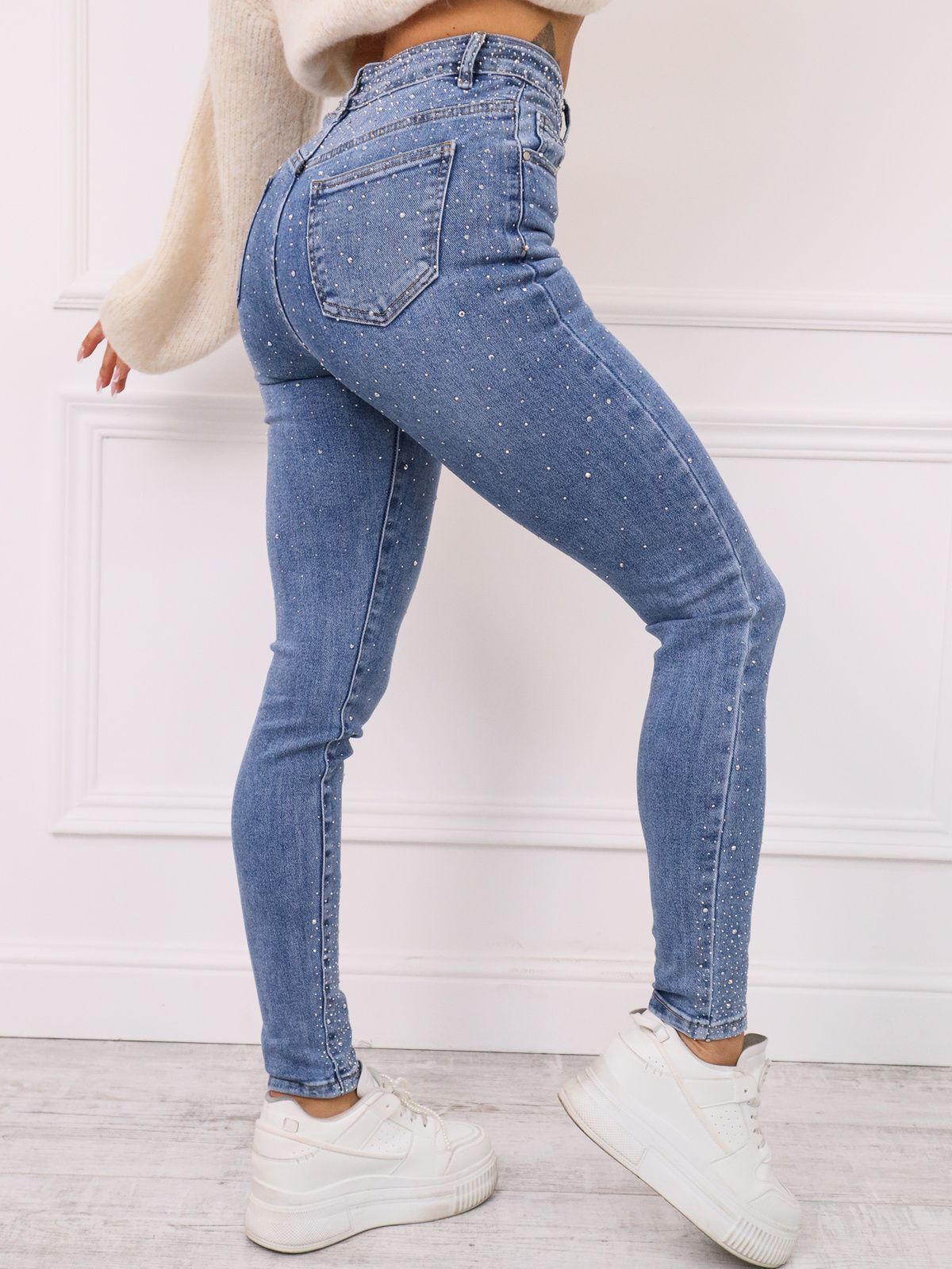 Spodnie jeansowe skinny zdobione cyrkoniami z przodu nogawek. Elastyczny materiał, dopasowujący się do ciała.