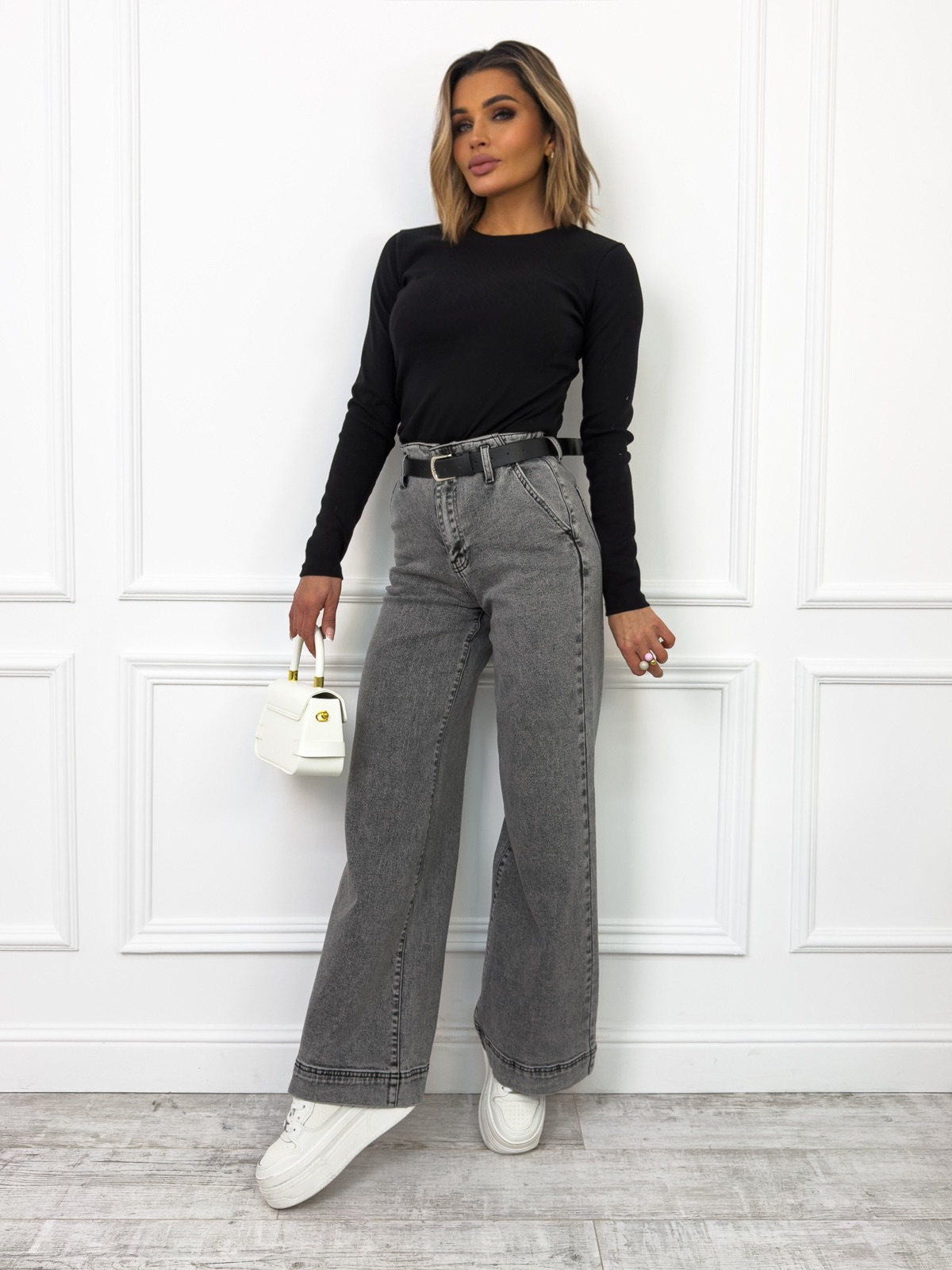 SPODNIE JEANSOWE Z WYSOKĄ TALIĄ I DŁUGIMI NOGAWKAMI + PASEK- NIEBIESKIE