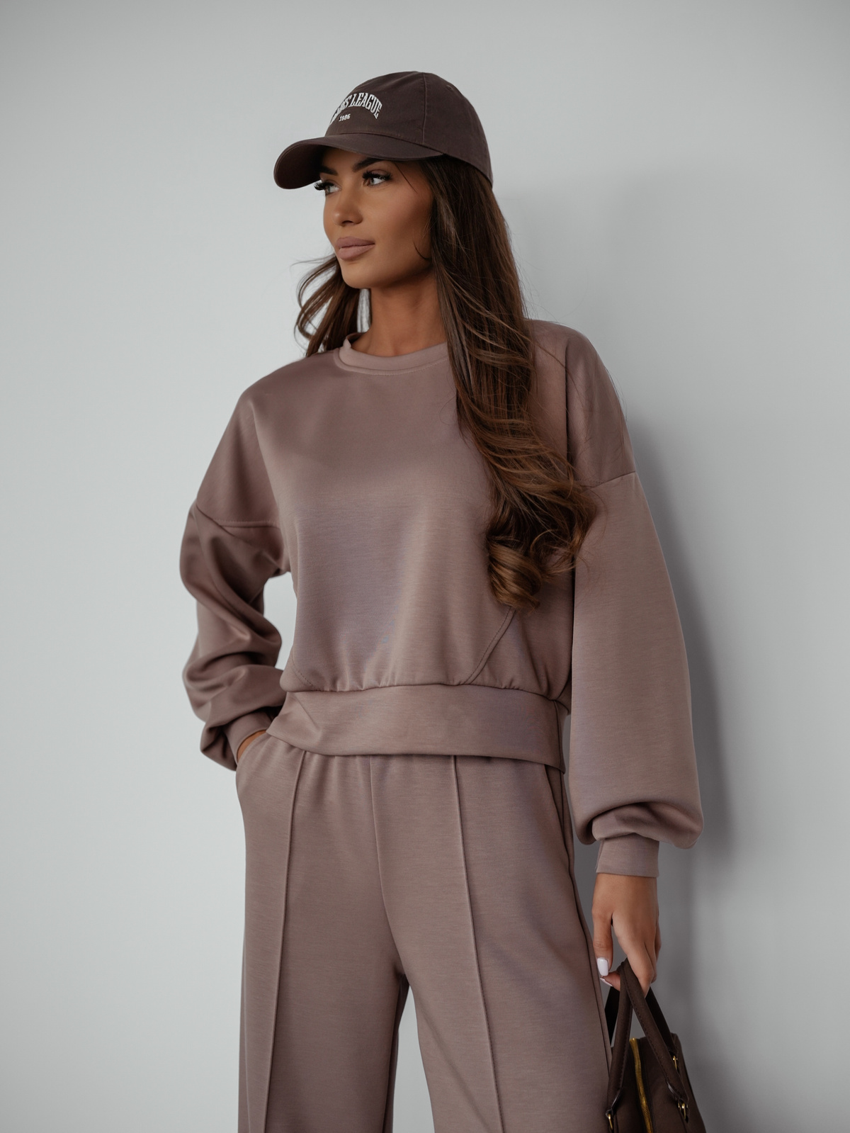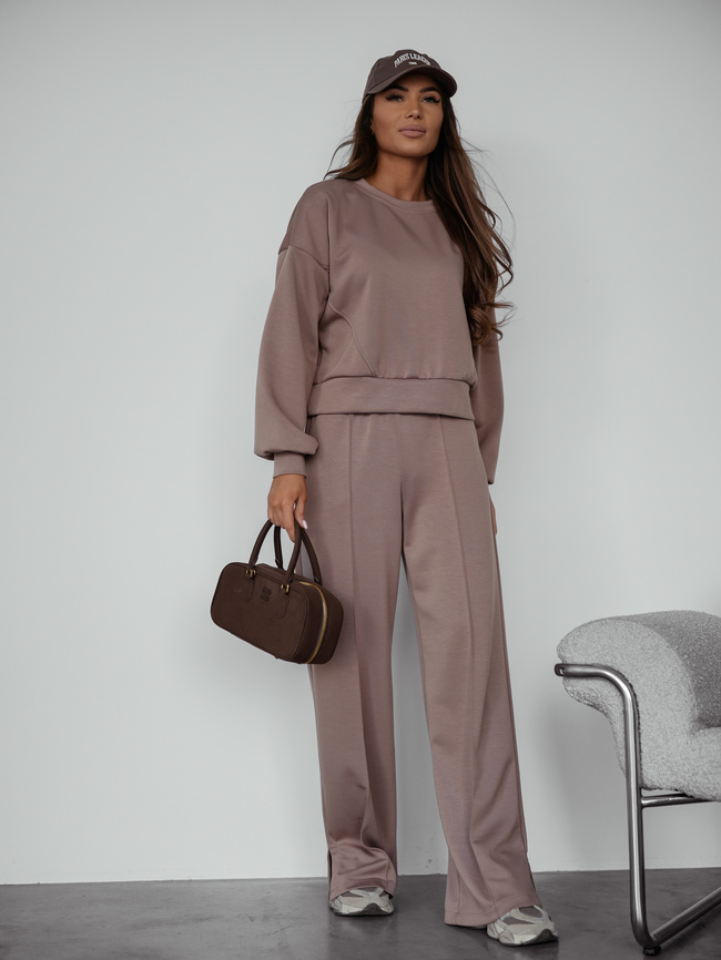 Komplet dresowy wykonany z materiału masełko, lekki i przyjemny w dotyku. Bluza klasyczna z okrągłym dekoltem. Spodnie w pasie z szeroką gumą i kieszeniach po bokach. oraz szerokie nogawki z przeszyciem z przodu i rozcięciem na nogawce.