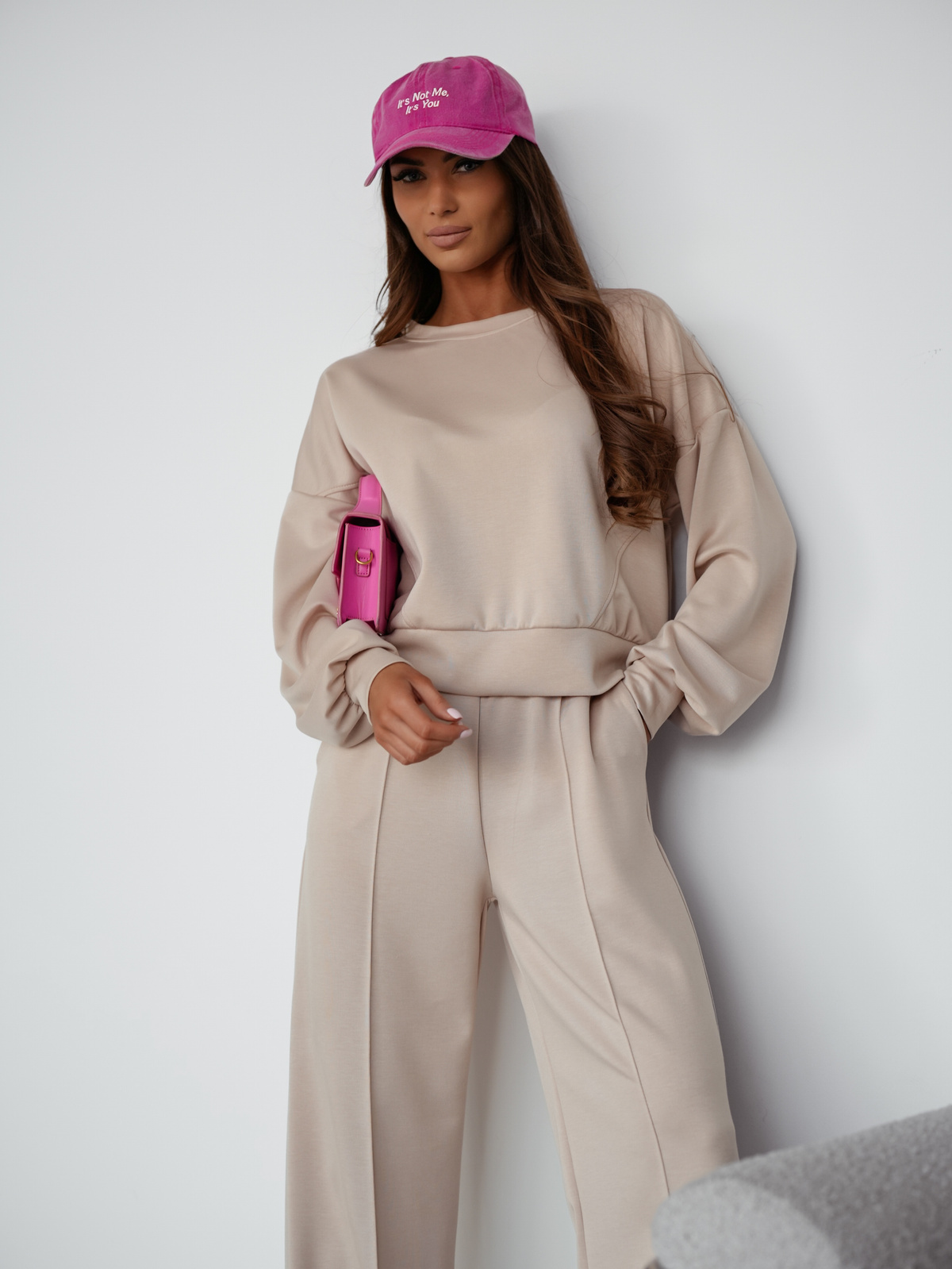 Komplet dresowy wykonany z materiału masełko, lekki i przyjemny w dotyku. Bluza klasyczna z okrągłym dekoltem. Spodnie w pasie z szeroką gumą i kieszeniach po bokach. oraz szerokie nogawki z przeszyciem z przodu i rozcięciem na nogawce.