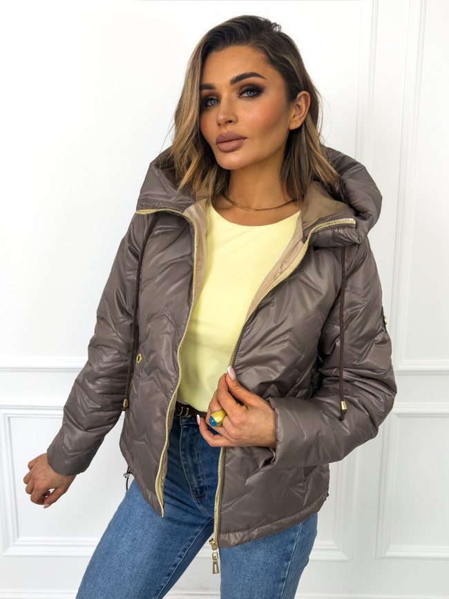 Kurtka przejściowa, pikowana z kapturem i ściągaczami po bokach.