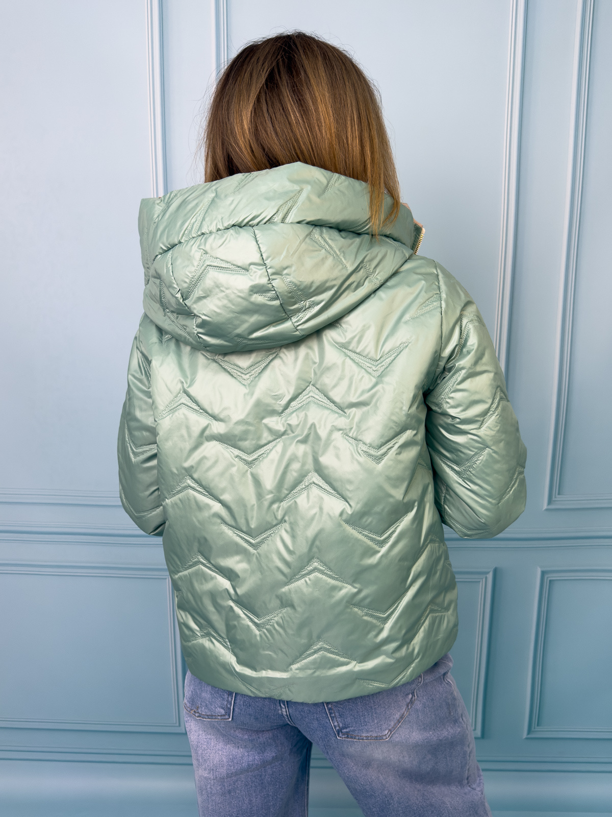 Kurtka przejściowa, pikowana z kapturem i ściągaczami po bokach i ozdobną naszywką na rękawie.