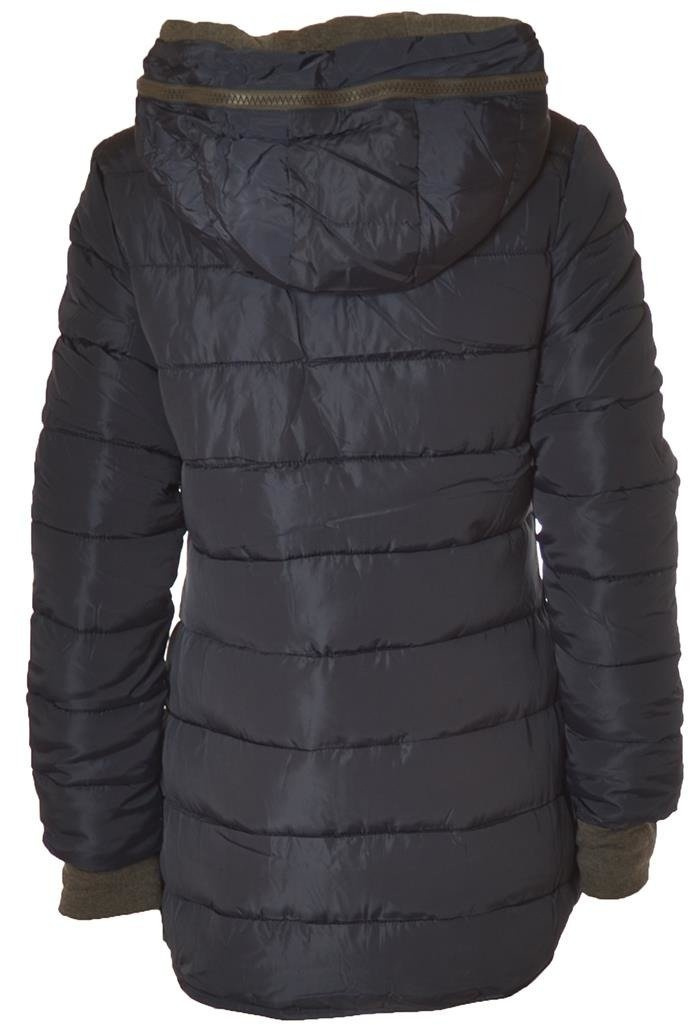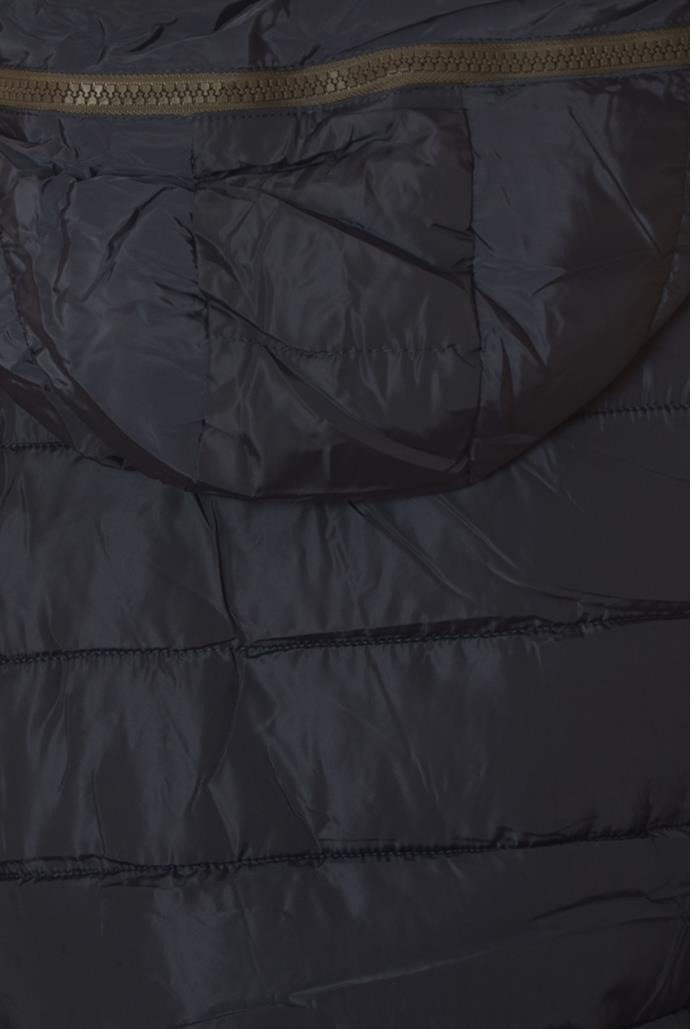 Granatowa,ortalionowa kurtka pikowana. Posiada kaptur z bawełnianą podszewką oraz z zamkami. Środek kurtki jest ocieplany futerkiem. Na końcach rękawów są ściągacze.