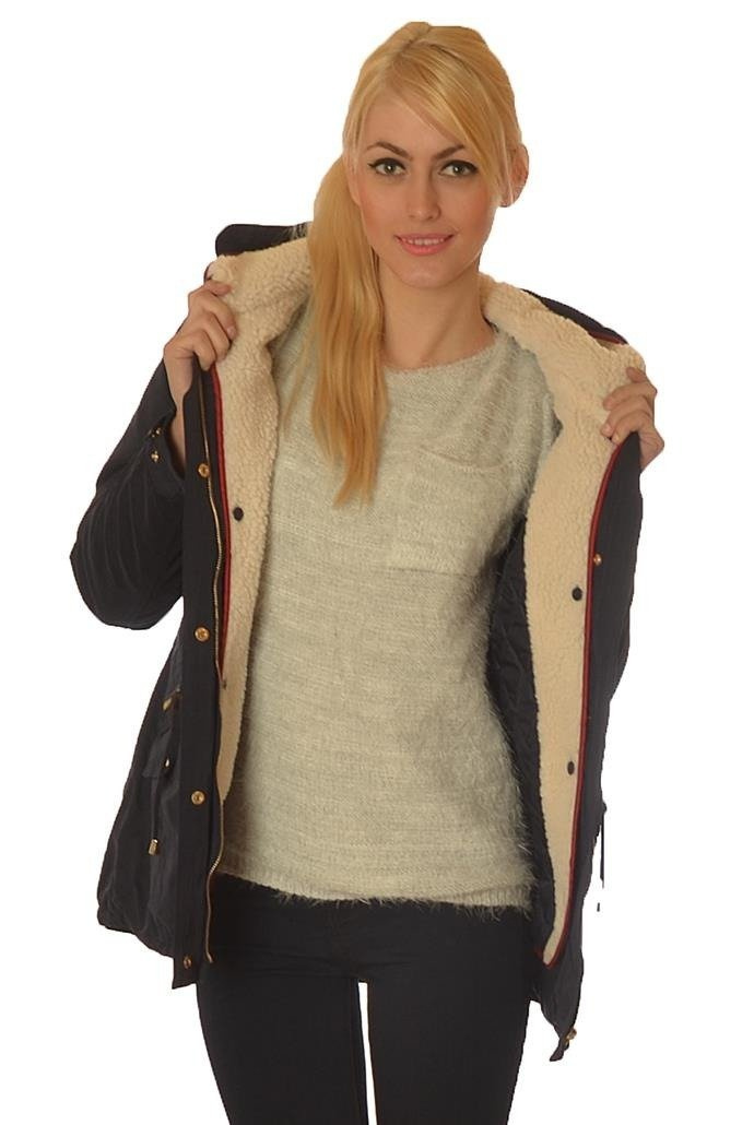Granatowa, ocieplana kurtka zimowa. Zapinana na zamek oraz wiązana w pasie sznurkiem. Kaptur ocieplany wełną.