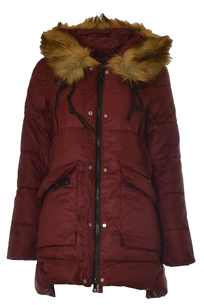 Bordowa kurtka zimowa zapinana na zamek i zatrzaski. Kaptur z doczepianym futerkiem. Rękawy wykończone ocieplanym ściągaczem.