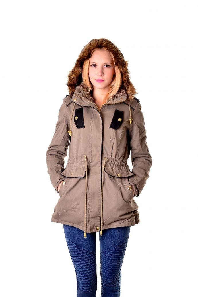 Bardzo ciepła, dłuższa kurtka z kapturem wykończonym futerkiem. Zapinana na zamek , oraz guziki, wiązana w talii, cztery kieszenie z przodu ze wstawkami skóry ekologicznej.