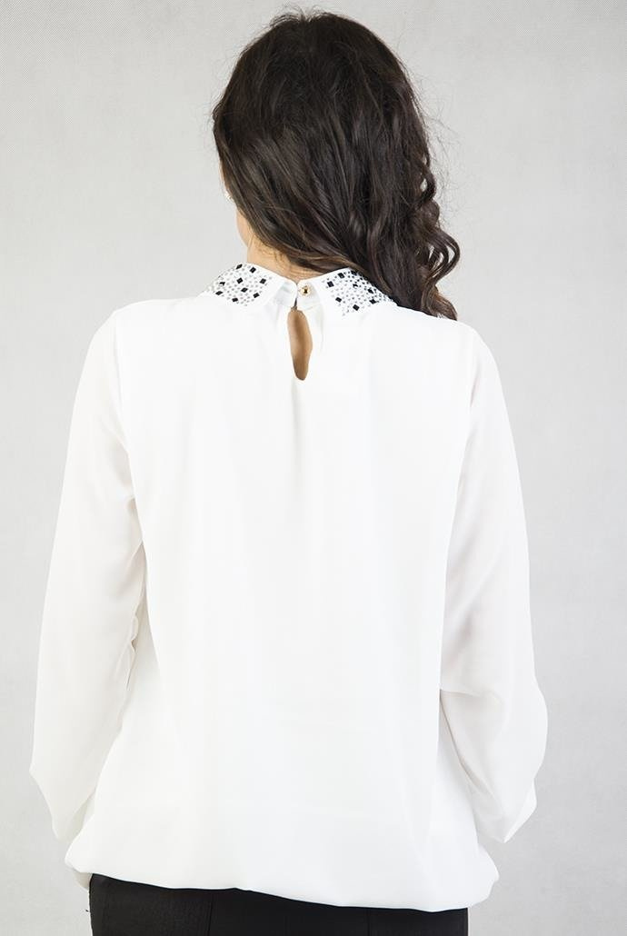 Biała bluzka z kołnierzem z cekinami zapinana na guzik z tyłu. Przy rękawach oraz w pasie wciągnięta gumka
