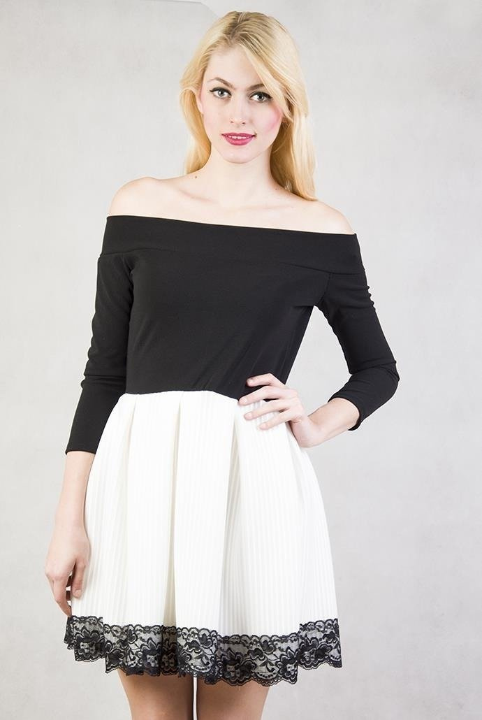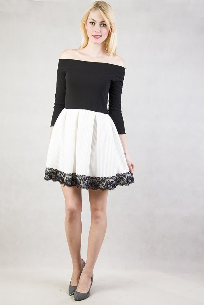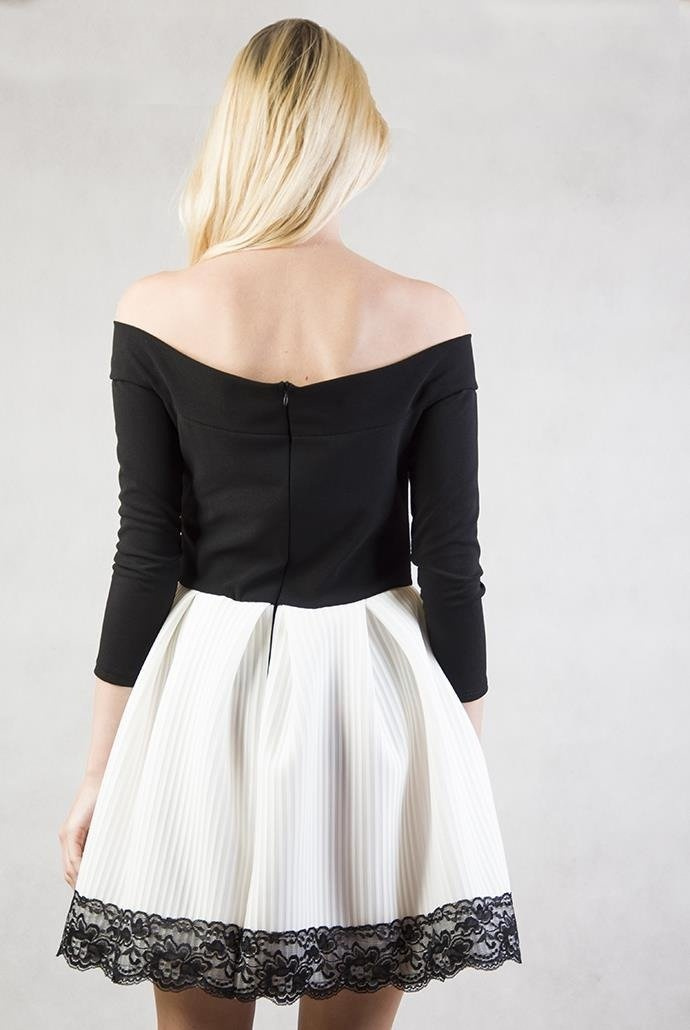 Czarno-biała sukienka rozkloszowana, obszyta koronką u dołu