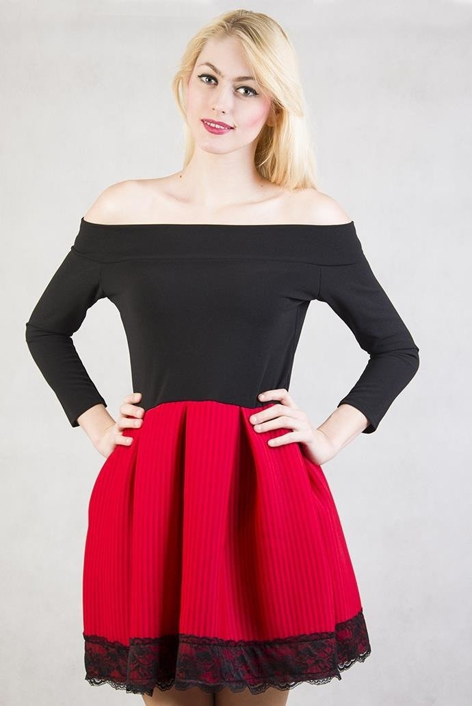 Czarno-czerwona sukienka rozkloszowana, obszyta koronką u dołu.