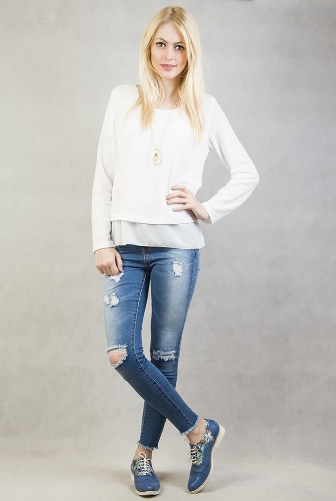 Biała, asymetryczna bluzka na długi rękaw z wisiorkiem, na dole doszyty tiul.