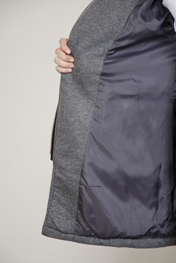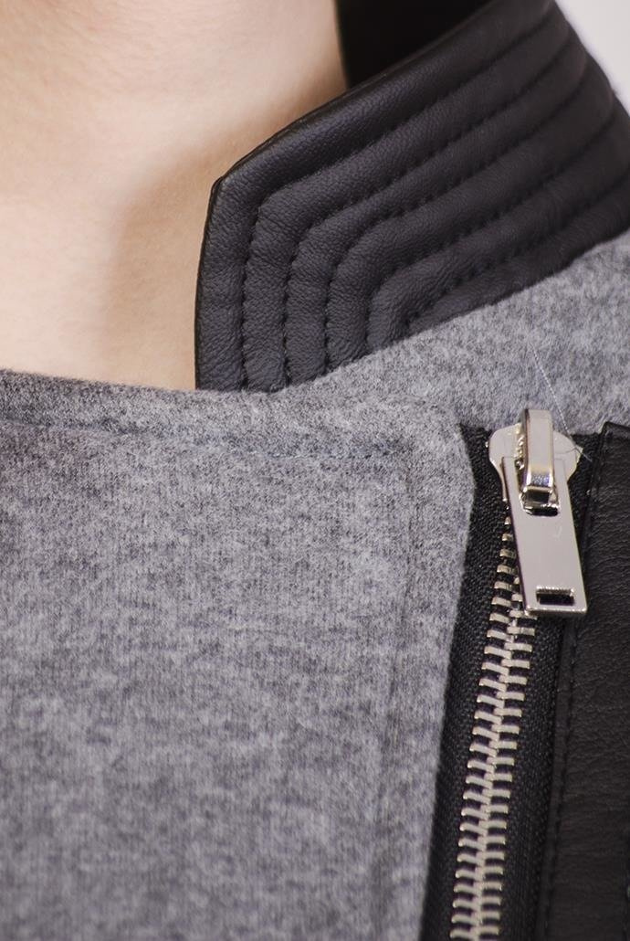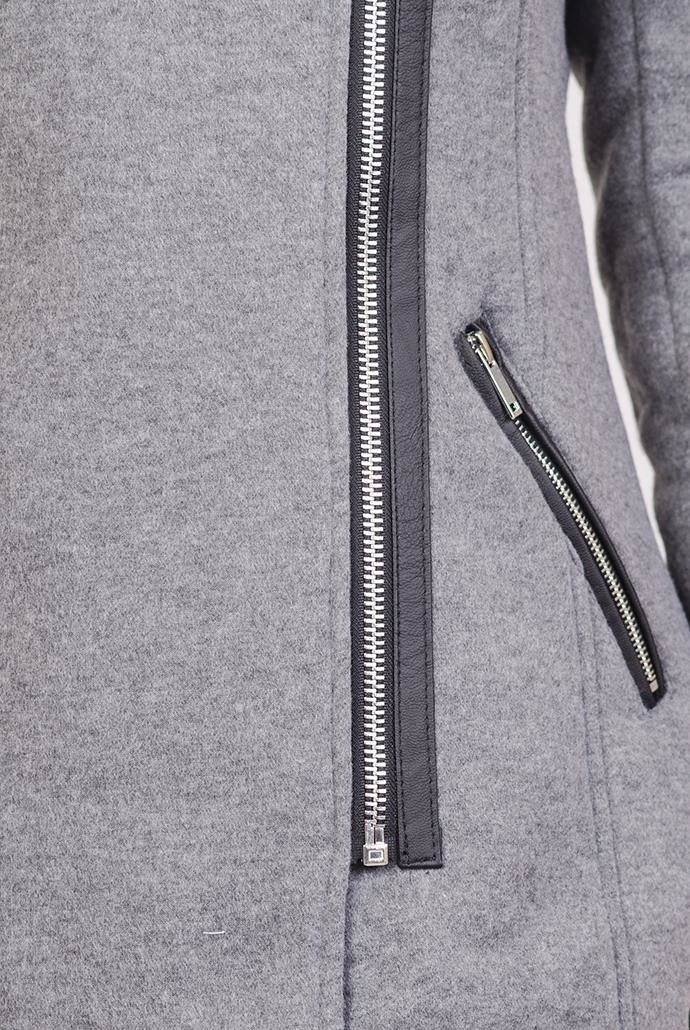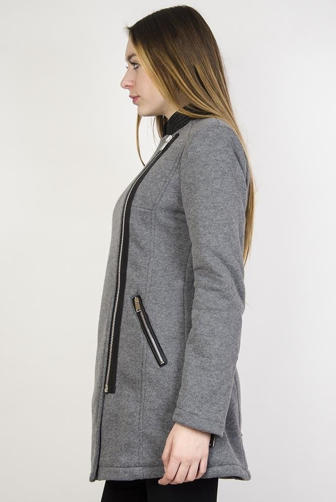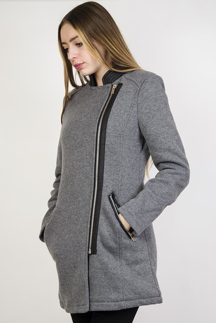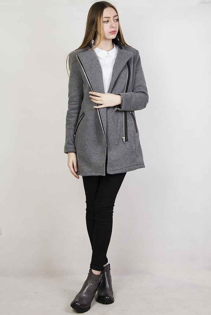 Ciemno-szary płaszcz ze skórkowymi wstawkami, zapinany na zamek.