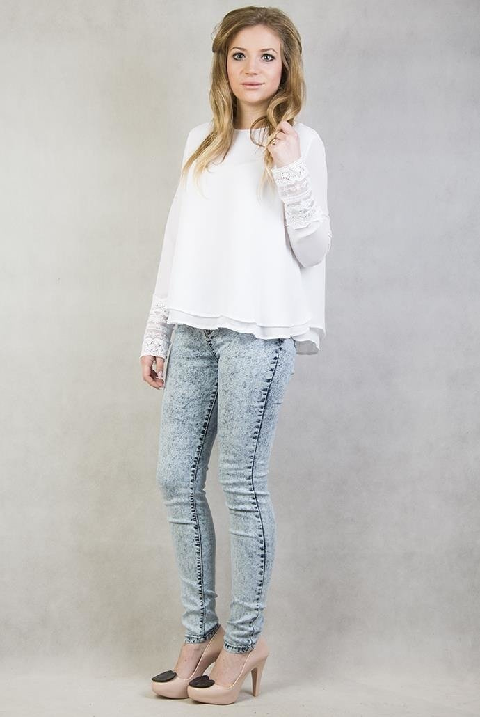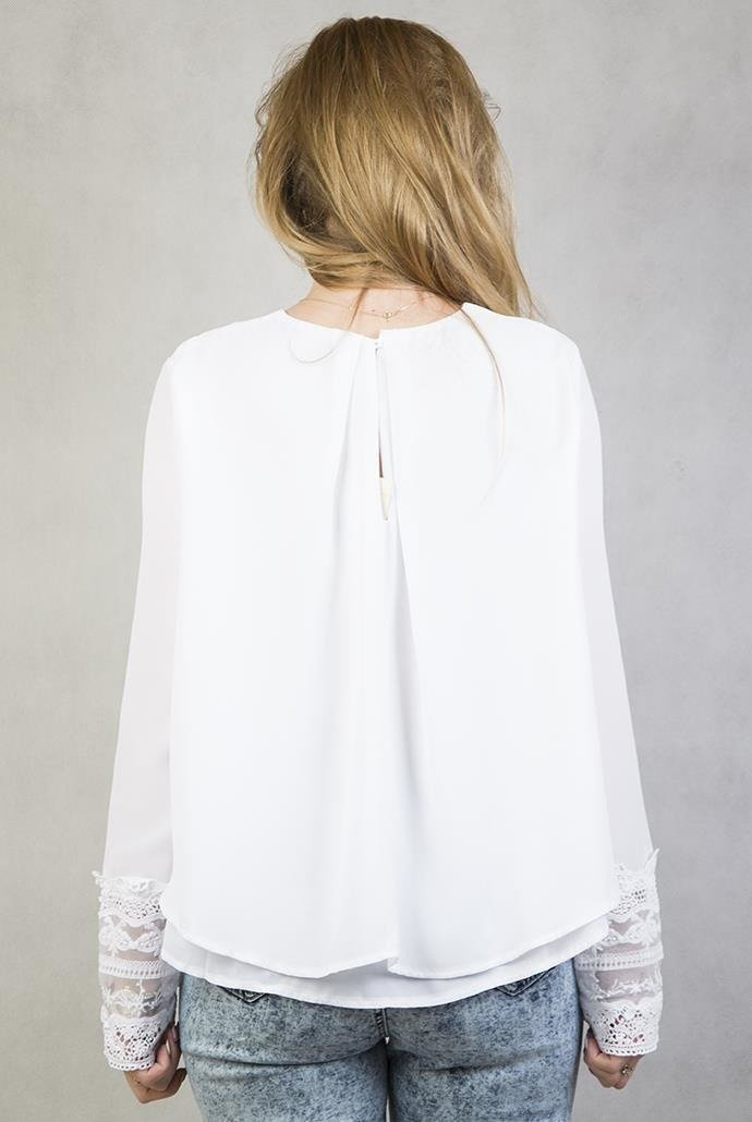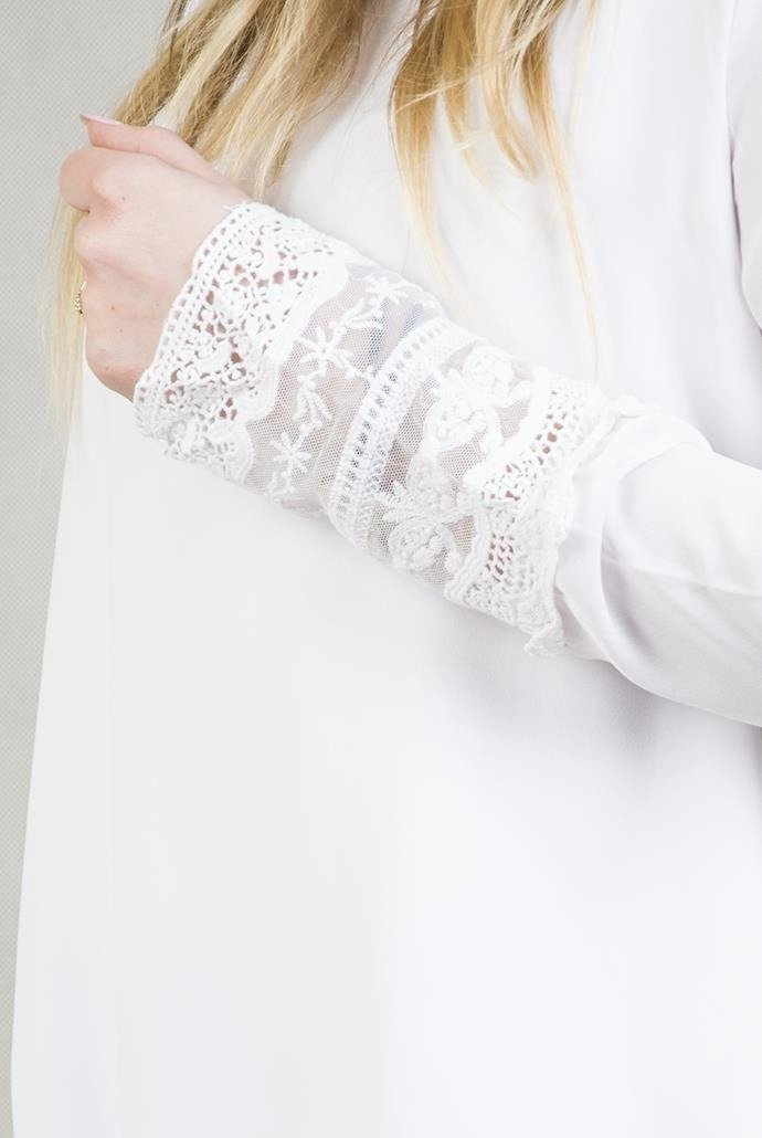 Biała bluzka na długi rękaw, z koronkowymi mankietami, zapinana na guzik z tyłu.