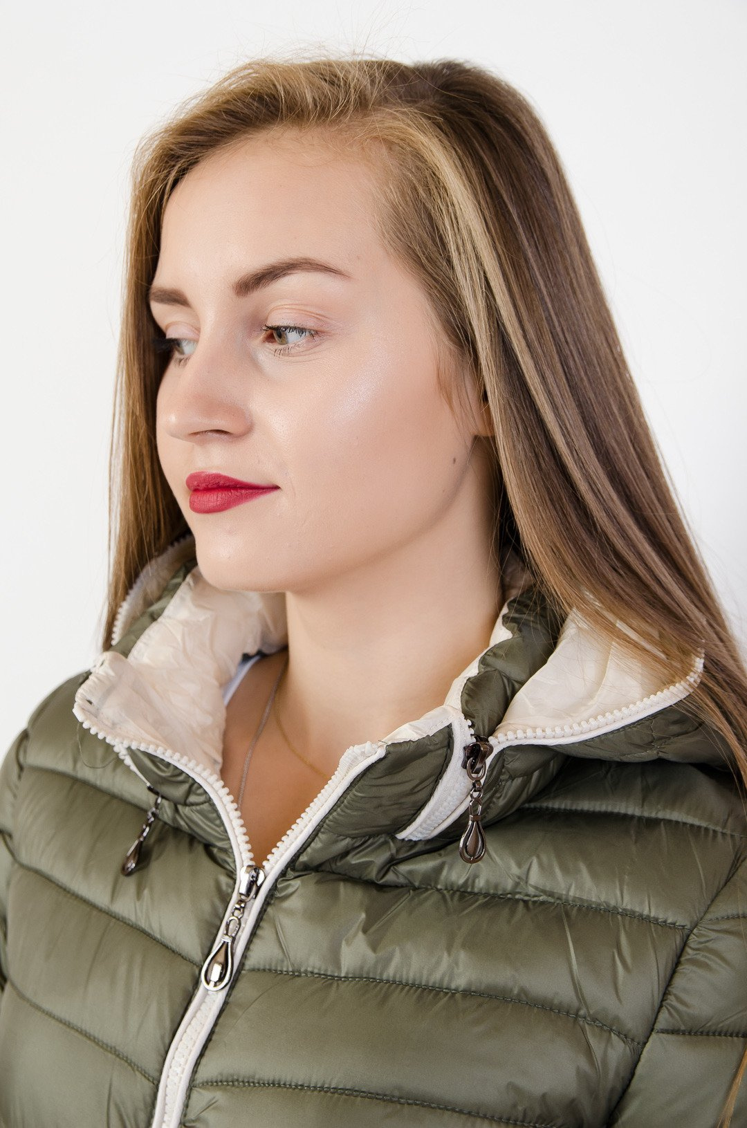 Khaki kurtka ortalionowa zapinana na zamek, z kapturem. Na dole ściągana sznureczkami. Na rękawie naszyta naszywka "7"