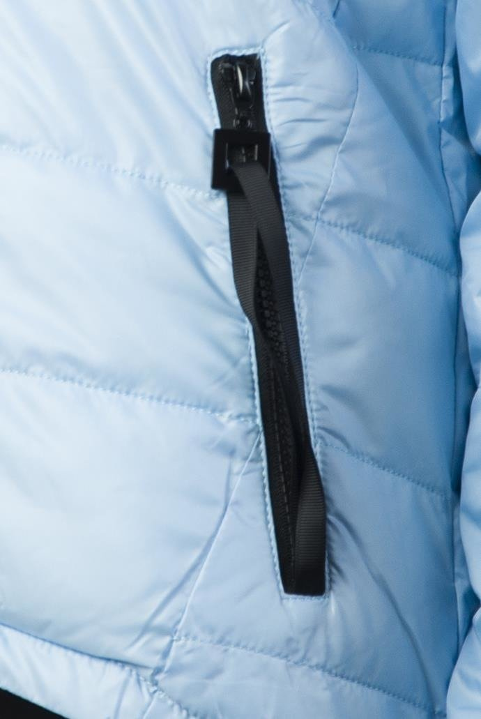 Wiosenna, niebieska, asymetryczna kurtka pikowana z kapturem zapinana na zamek.