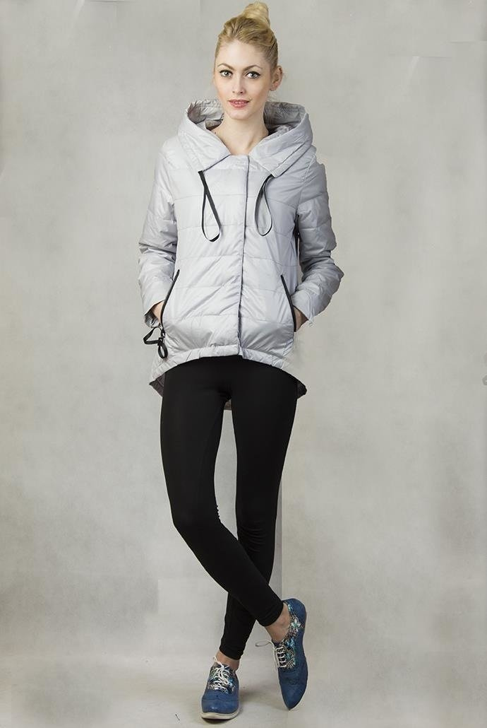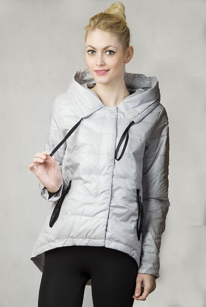 Wiosenna, asymetryczna szara kurtka z kapturem zapinana na zamek.